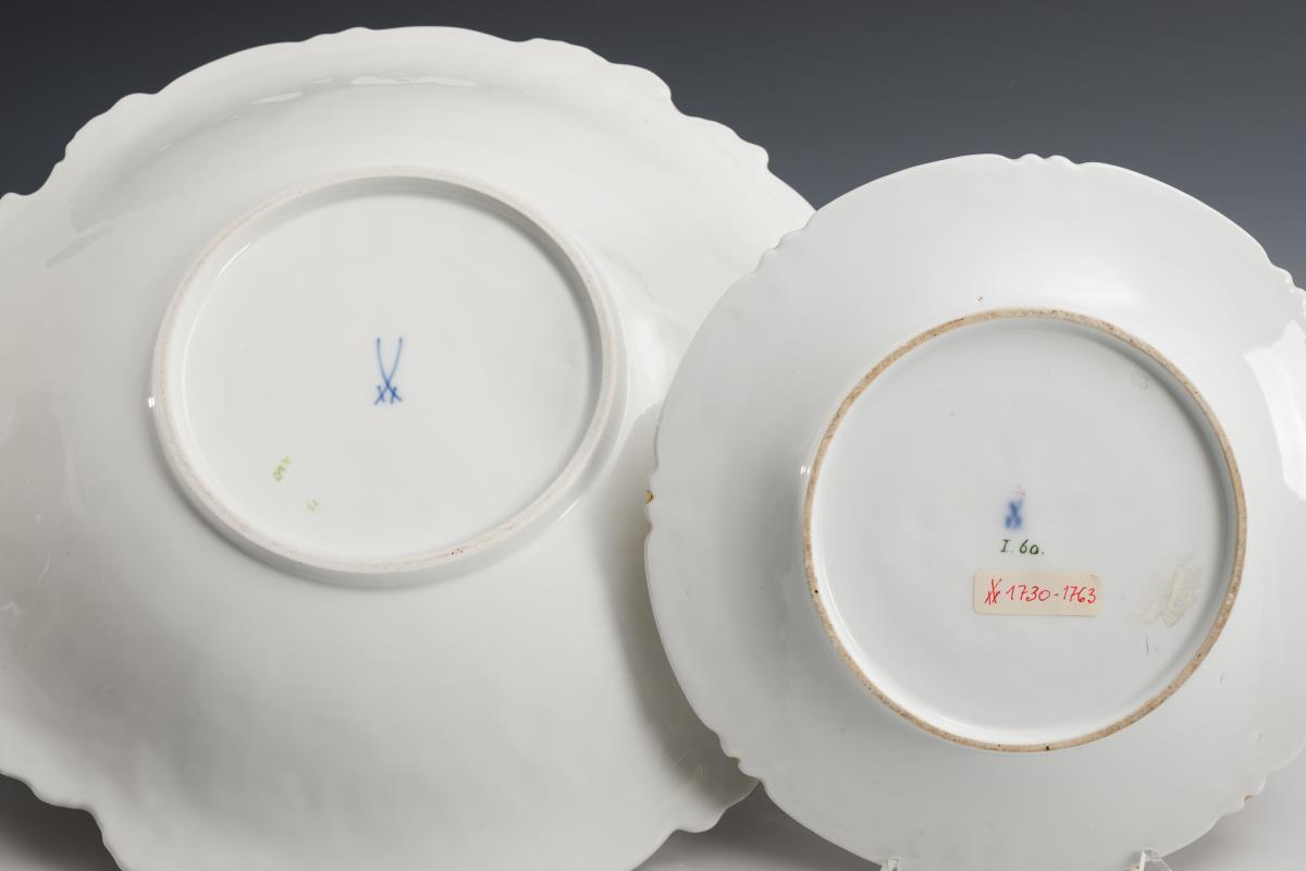 1x 1816-1824: Teller mit Rocaille- und Blumenrelief sowie Perlfond (Ø 20,5 cm). / 1x 1934-1945: Schale mit Blumenrelief, purpurfarben staffiertem Rand und der Darstellung einer Mohnblume im Spiegel (Ø 31 cm). 1x minimaler Goldabrieb.