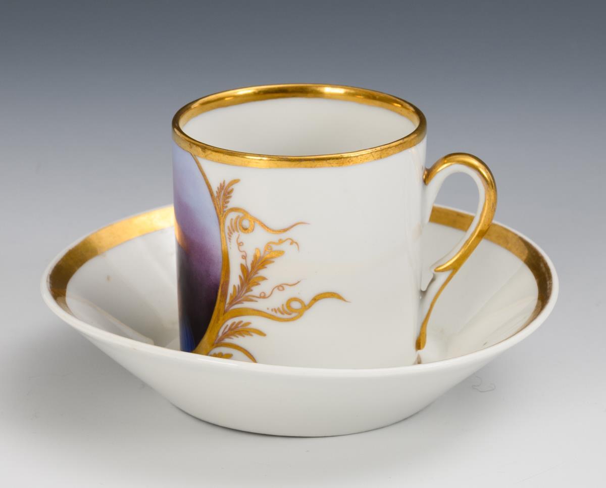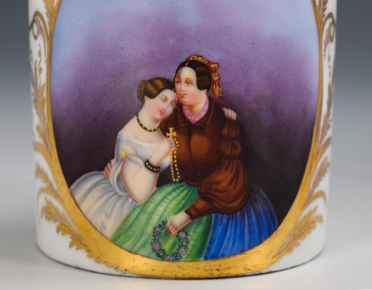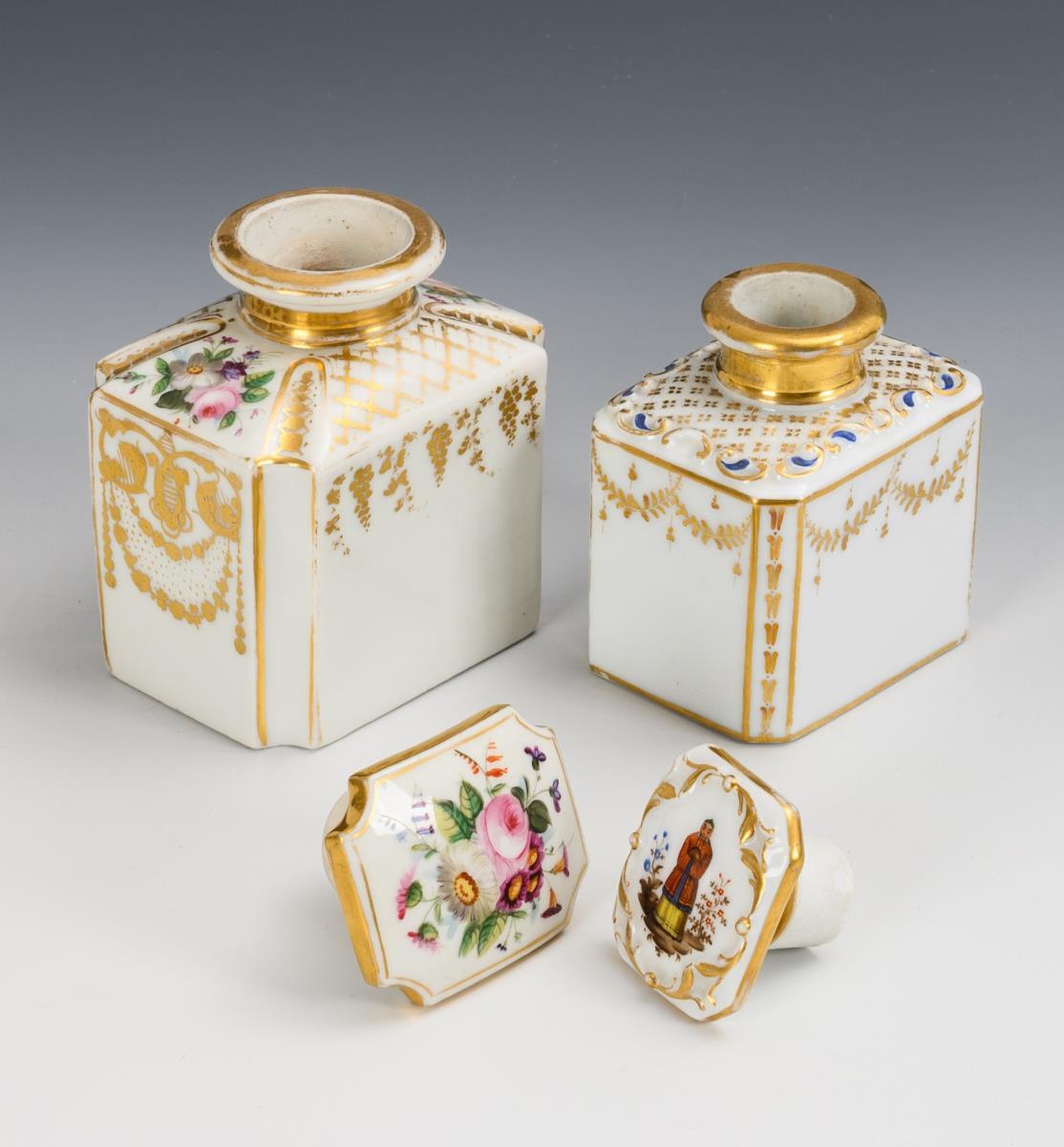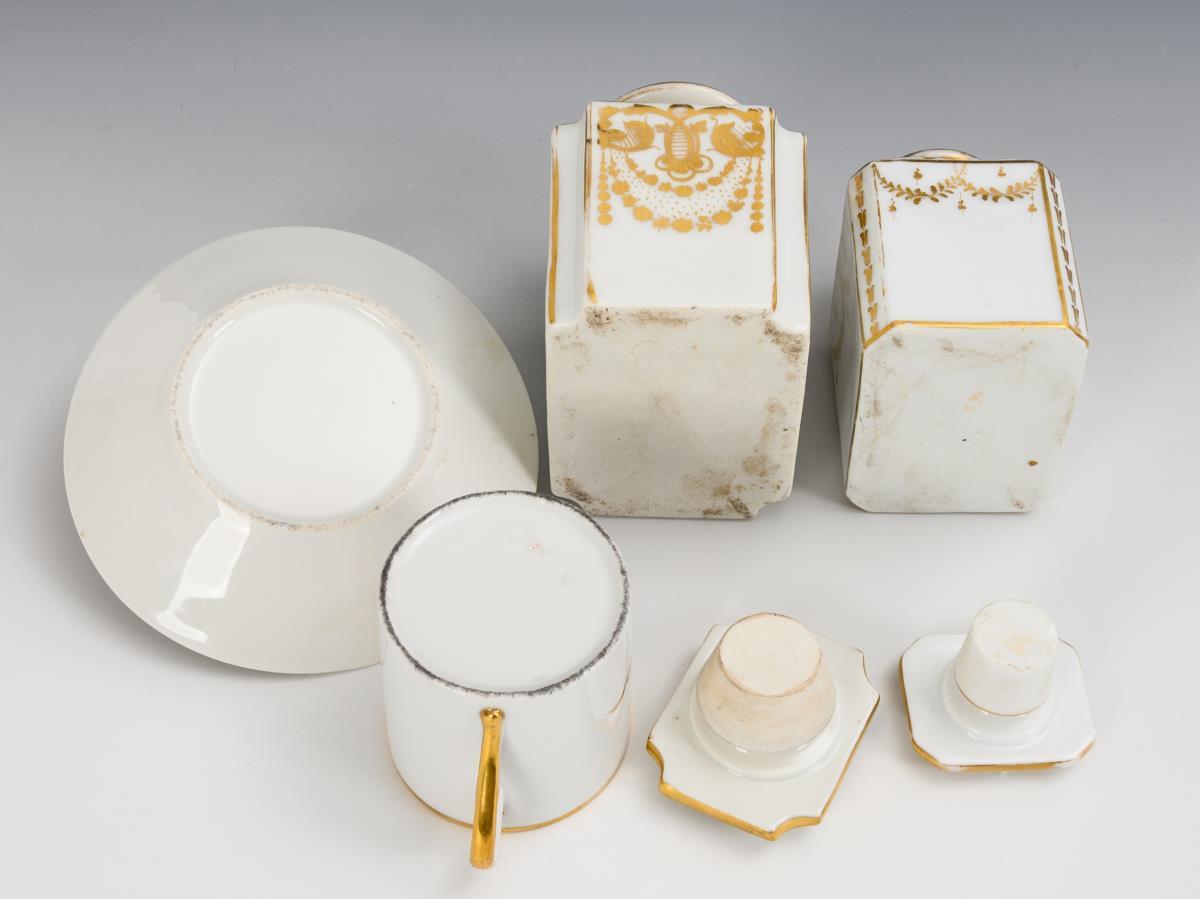 1x ungemarkt: Zylindertasse mit Ohrenhenkel, schauseitig ein von Blattwedeln gerahmtes Medaillon mit der Darstellung einer Mutter mit Tochter, im Spiegel der Untertasse die Datierung "in [...] 1836" (H Tasse 6,5 cm, Ø Untertasse 13 cm). / 1x gemarkt Gotha, 1805-1835: rechteckige Teedose mit Rocaillerelief, auf dem Deckel die Darstellung eines Chinesen (H 11 cm). / 1x ungemarkt: rechteckige Teedose mit Blumenmalerei und Goldmalerei (H 12 cm). 1 Teedose im Boden haarrissig, partieller Goldabrieb.