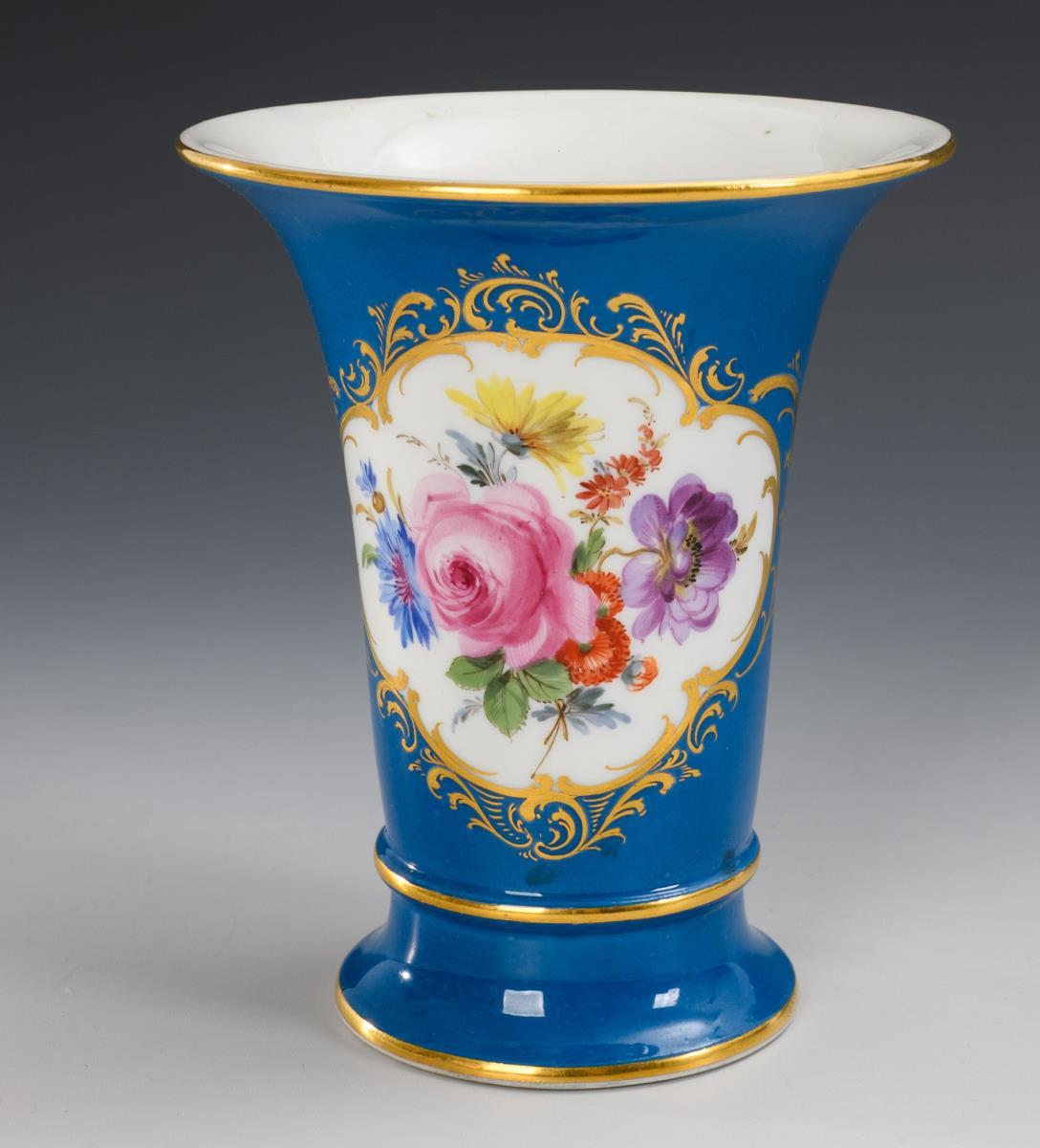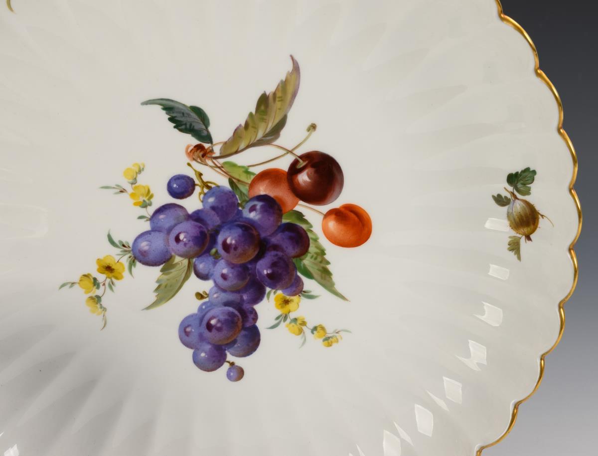 1x Fächerteller mit Fruchtmalerei (Ø 28 cm). / 1x Kratervase mit blauem Fond und einem schauseitigen Blumenbukett (H 13,5 cm). Haarriss in der Vase.
