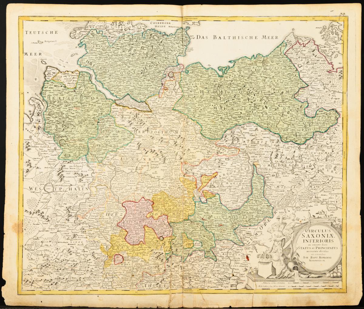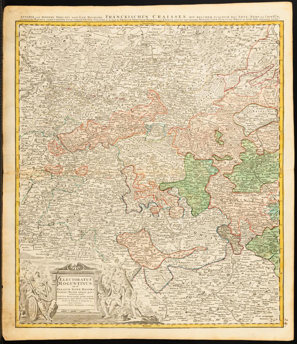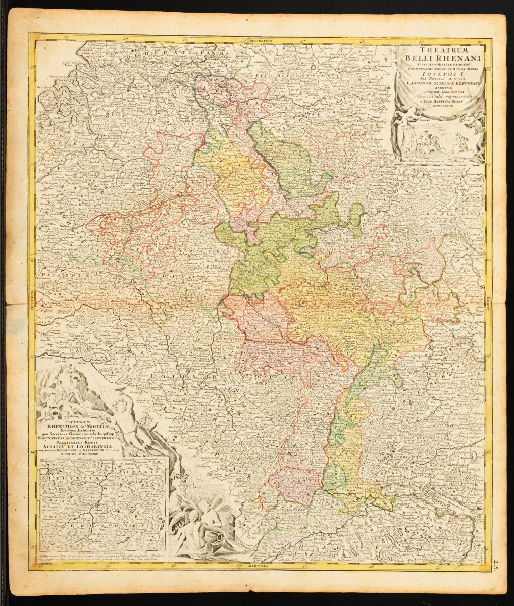 Landkarte des Rheingebietes, Blatt: 61x 52 cm. Detaillierte Rheinlaufkarte vom Bodensee bis zur Nordsee, mit figürlicher Titelkartusche "Theatrum Belli Rhenani [...]" und schemenhafter Gesamtansicht von Landau, großer figürlicher Kartusche unten links "Fluviorium Rheni, Mosae ac Mosella [..]" und mit Nebenkarte des Quellgebietes des Rheins, Legende und Meilenzeigern, ca. 1720. Blatt stockfleckig, hinterklebte Bugfalte, Randbereich gebräunt | Landkarte des Niedersächsischen Reichskreises, Blatt: 52 x 61 cm. Detailreiche Landkarte des nördlichen Teils von Deutschland, mit figürlicher Titelkartusche "Circulus Saxoniae Inferioris [...]", Meilenzeigern, um 1730. Blatt stockfleckig, hinterklebte Bugfalte, unterer Bereich rissig und hinterklebt, Randbereich gebräunt | Landkarte des Fränkischen Reichskreises, Blatt: 61x 52 cm. Detailreiche Karte des Fränkischen Reichskreises mit Rheinlauf, mit figürlicher Titelkartusche "Electoratus Moguntinus ut et palati: infer Hassiae [...]", oberer Rand mit Titel in deutscher Sprache "Anderer und mindere Theil des gantzen hochlöbl. Fränkischen Craisses, mit welchem zugleich das Ertz- Stift- und ChurFürstenthum Mayntz [...]"., Meilenzeiger, ca. 1710. Blatt stockfleckig, hinterklebte Bugfalte, Randbereich gebräunt | Landkarte der Iberischen Halbinsel, Blatt: 52 x 61 cm. Detaillierte Landkarte der Iberischen Halbinsel mit Spanien und Portugal, mit wappenverzierter und allegorischer Titelkartusche "Regnorum Hispaniae et Portugalliae [...]", Meilenzeigern und Titel in spanischer Sprache am oberen Rand, bemerkenswert sind die eingezeichneten alten Straßen, ca. 1728. Blatt stärker griffspurig und stockfleckig, hinterklebte Bugfalte, unterer Rand verstärkt | Landkarte von Venetien, Blatt: 52 x 61 cm. Detaillierte Landkarte der nördlichen Teils von Italien, mit Venetien, Mantua, Emilia-Romagna und dem Golf von von Venedig, figürliche Titelkartusche "Dominii Veneti cum Vicinis Parmae Mutinae Mantuae et Mirandoli [...]", Legende und Meilenzeigern, ca. 1725. Blatt stärker griffspurig und stockfleckig, hinterklebte Bugfalte.