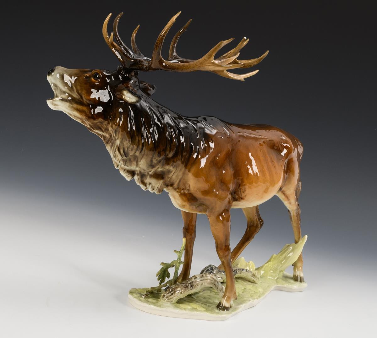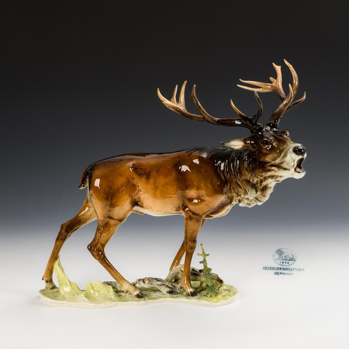 "Der Selber Hans Achtziger (1918 – 2003) absolvierte von 1934 bis 1937 eine Modelleur-Ausbildung in der Porzellanfabrik Lorenz Hutschenreuther, bevor er anschließend bis 1939 an der Fachschule für Porzellanindustrie in Selb bei Fritz Klee studierte. Nach dem Zweiten Weltkrieg war er von 1946 bis 1948 Schüler der Bildhauerklasse von Hans Panzer auf der Meisterschule für Bau- und Kunsthandwerker in München. Anschließend nahm er seine langjährige Entwurfstätigkeit in der Hutschenreuther Kunstabteilung auf, wo er ab 1961 die Leitung übernahm. Er prägte das Figurenprogramm der Hutschenreuther Kunstabteilung ganz entscheidend und gab der Kollektion beachtliche Impulse. In der Gestaltung seiner Tierfiguren zielte er darauf ab, einen Bewegungsmoment lebendig einzufangen, was ihm mit der Figur des Platzhirsches durchaus gelang." (Petra Werner, in: Katalog: Auf der Pirsch - Jagdbare Tiere in Porzellan, Porzellanikon (Bd. 117), Hohenberg a.d. Eger 2015, S. 34/Kat.-Nr. 42).