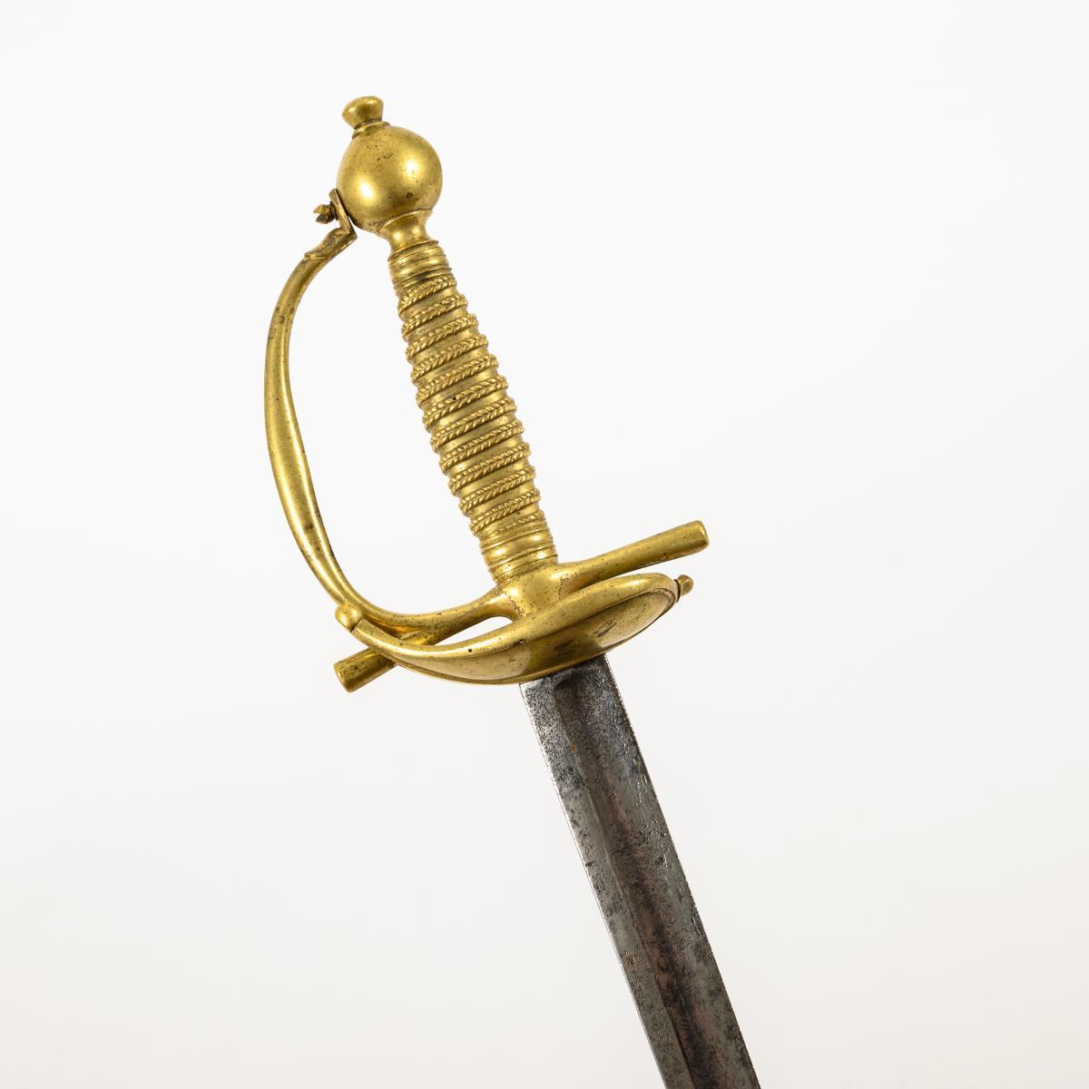 In der Art der Degen für Kürassieroffiziere. Gerade, einschneidige Klinge mit breitem Hohlschliff. Reste von Musterätzungen mit Profilkopf und Wappendarstellung. Messinggefäß mit herzförmigem, gespaltenem Stichblatt, gerader Parierstange und Kugelknauf. Optische Drahtwicklung, hier jedoch mit dem Griff gegossen. Korrosionsnarben.