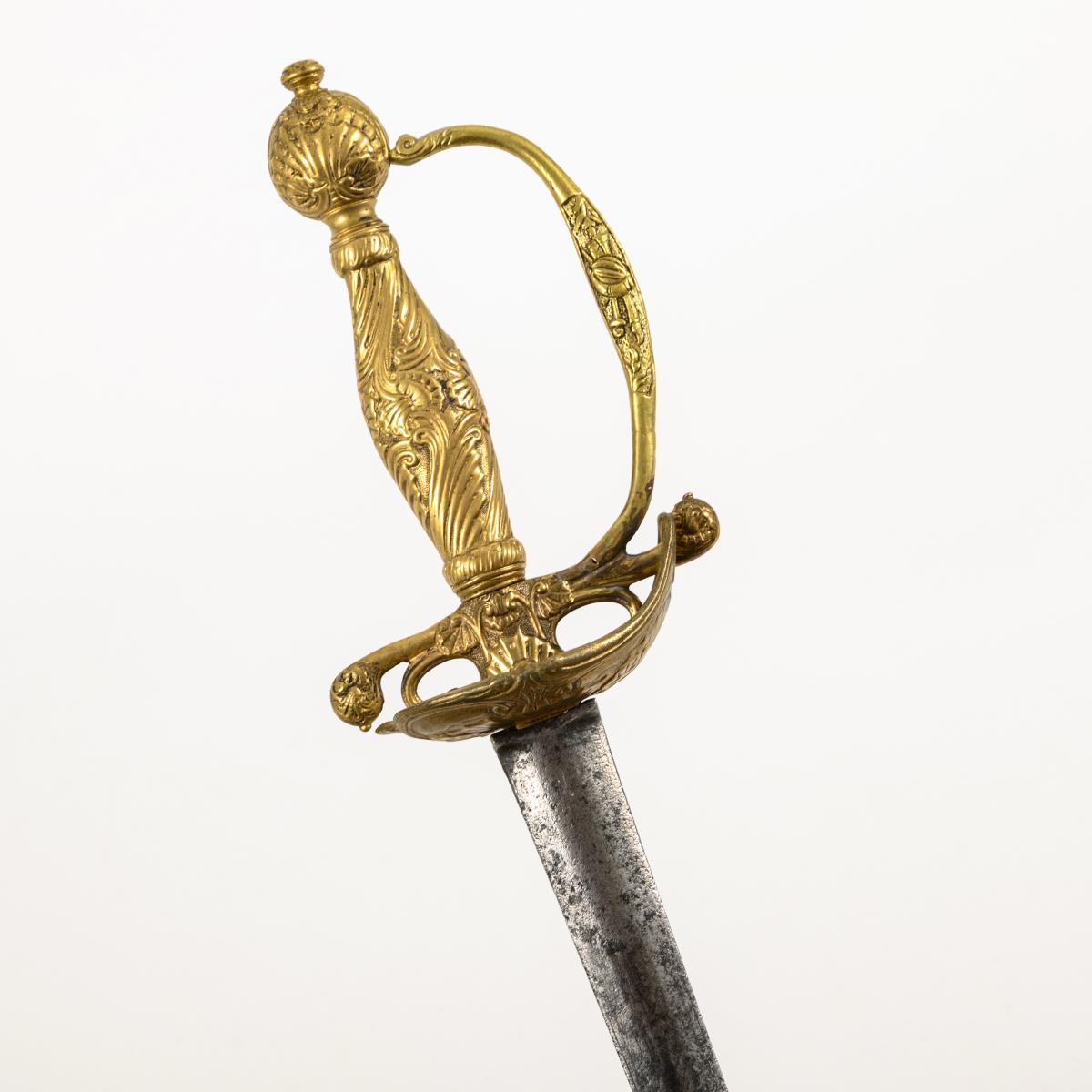 Gerade, zweischneidige Klinge mit Resten von Mustergravur. Herzförmiges Stichblatt, Griff und Kugelknauf mit reliefierten Muschelornamenten verziert. Auf dem Griffbügel sich kreuzende Gewehre und Pistolen als Ornament. Fingerhaken. Klinge mit Korrosionsnarben.