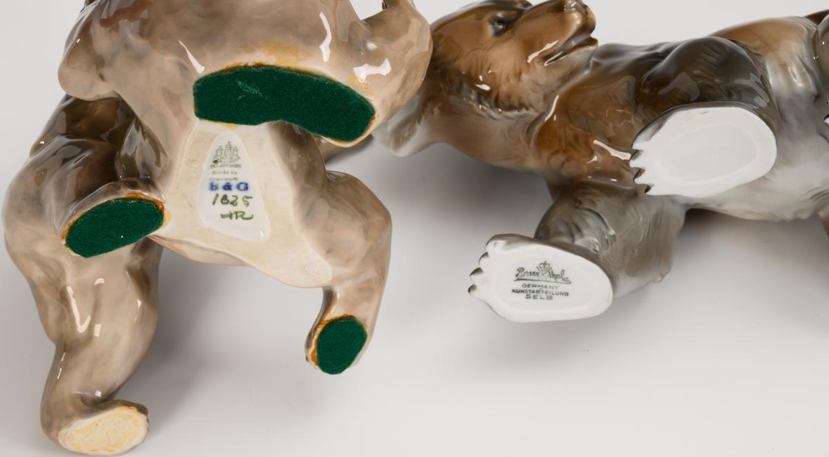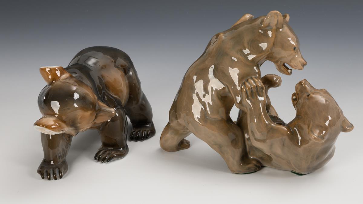 1x ROSENTHAL, 1938, Modell-Nr. 1594, Entwurf 1936 von Gustav Oppel (1891-1978): junger, laufender Bär (H 11 cm). / 1x BING & GRÖNDAHL, 1952-1958, Modell-Nr. 1825: zwei miteinander raufende Jungtiere (H 14,5 cm). Minimale Bestoßung an 1 Tatze.