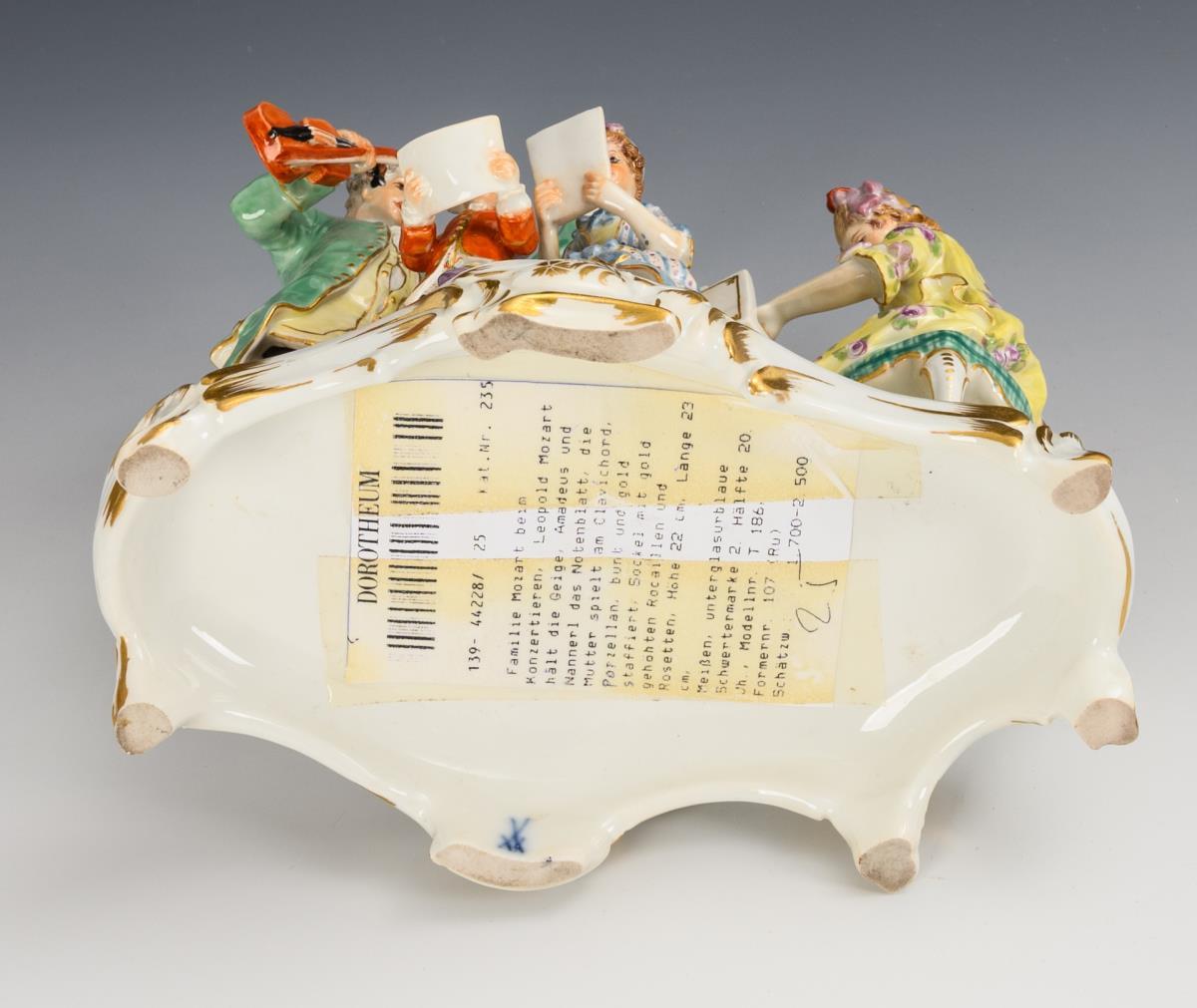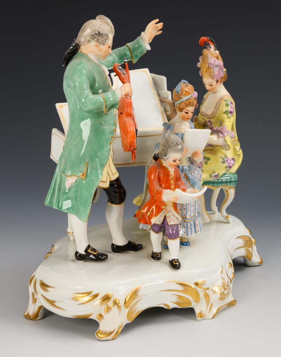 Am Spinett sitzende Dame, zwei singende Kinder mit Notenblättern sowie der dirigierende Vater mit Violine. Zopf des Mannes bestoßen.