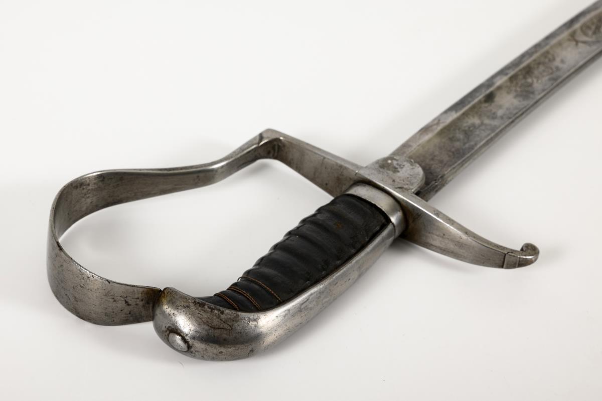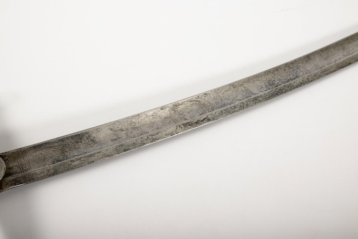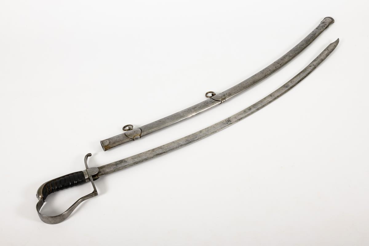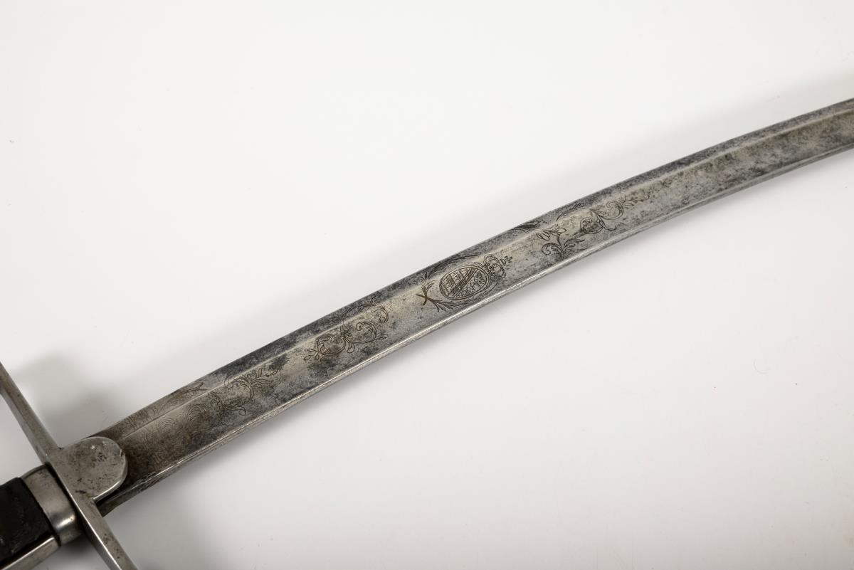 Stark gekrümmte, einschneidige Klinge mit breitem Hohlschliff und Pandurenspitze. Florale Gravuren und sächsisches Wappen. Eisengefäß, glatter, kurzer Lappen, gerade Parierstange, am nach unten gebogenen Ende eine alte Reparaturstelle. Ledergriff, 9fach gerillt, Drahtwicklung nur in Resten vorhanden. Blanke Metallscheide mit gebuckelten Bändern für die zwei beweglichen Ringe.