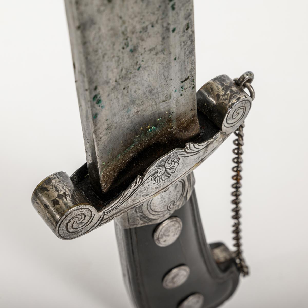 Plaute. Breite, leicht gekrümmte, einschneidige Klinge mit Spitze in der Rückenlinie und sehr breiter, flacher Hohlschliff. Parierstange fungiert auch als Abschluss für die Scheide. Schwarzer Holzgriff mit hakenförmigem Ende und Kettchen. Schwarze Lederscheide mit durchbrochen vertiefter Musterung und zwei beweglichen Trageringen.