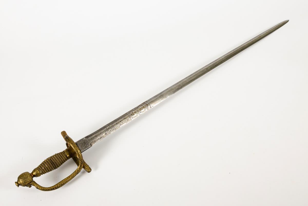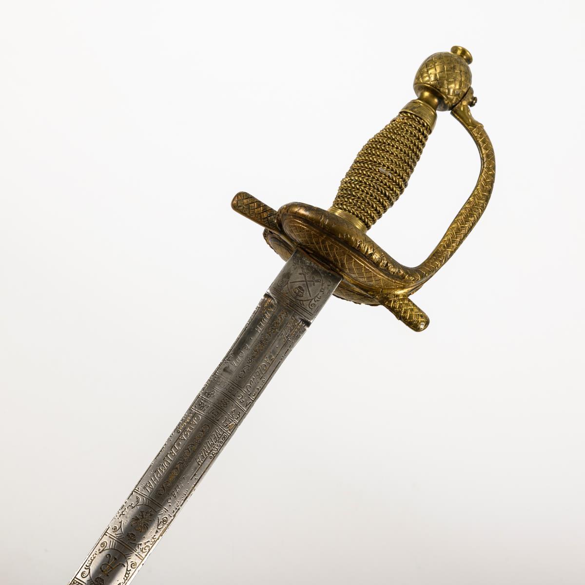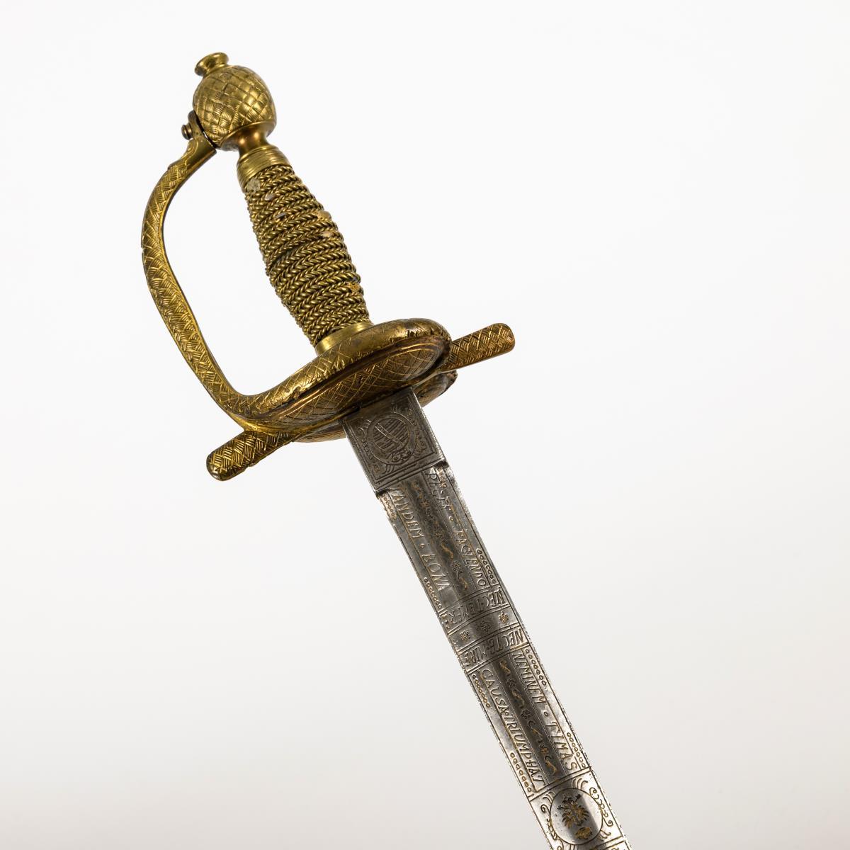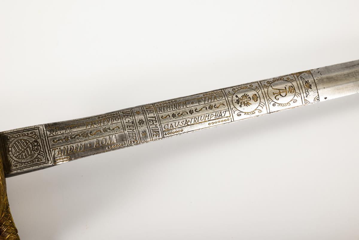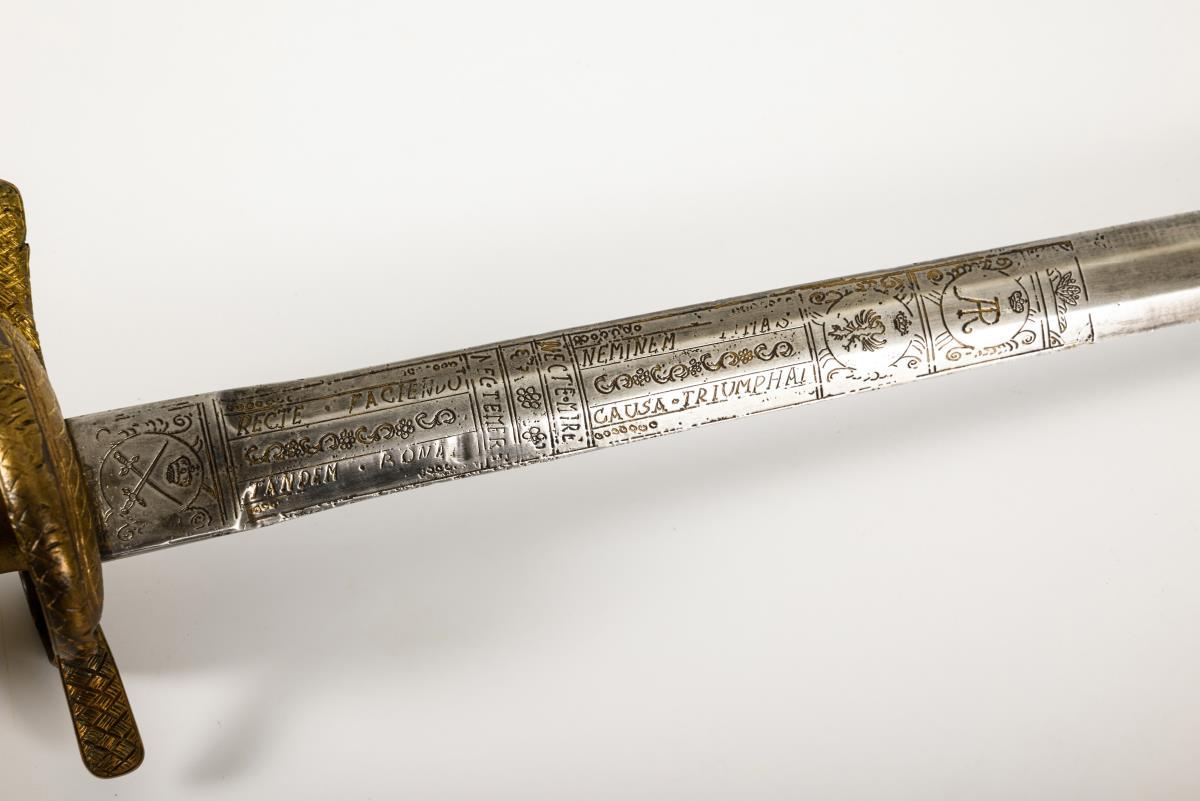 Gerade, zweischneidige, sechspassige und reich verzierte Klinge. Fehlschärfe mit gekreuzten Klingen bzw. sächsischem Wappen, jeweils bekrönt vom Kurhut. Im ersten Viertel bechriftet: "Nec temere nec timide, recte faciendo neminem timeas, tandem bona causa triumphat", sowie bekrönter Adler und Monogramm "AR". Messinggriff mit grober Drahtwicklung. Gefäß mit herzförmigen Stichblatt, Parierstange, Bügel und Knauf in Flechtoptik. Drahtwicklung mit Reparaturstellen.