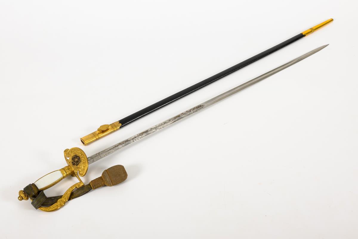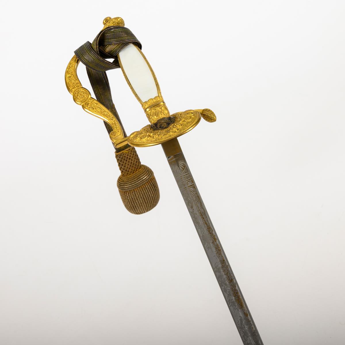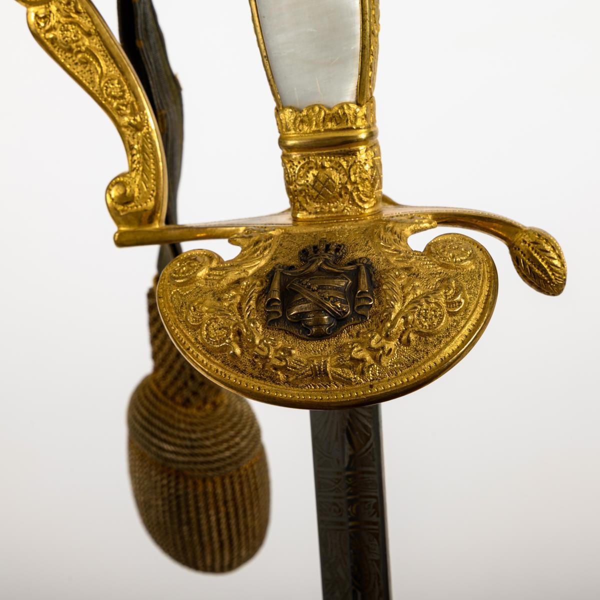 Gerade, einschneidige Klinge mit Hohlschliff und Spitze in der Mittellinie. Hälftig mit Ätzmuster dekoriert. Reich reliefiertes Messinggefäß mit Perlmuttgriff. Auf dem Stichblatt sächsisches Wappen als Applikation. Schwarze Lederscheide mit Palmettknauf. Portepee.