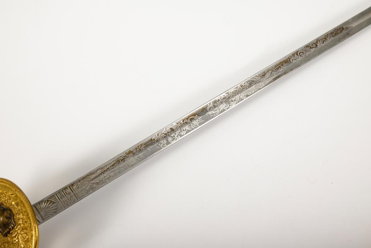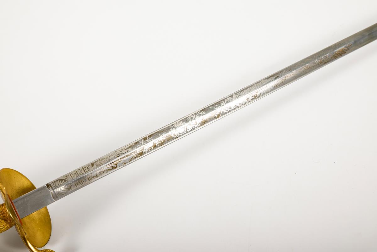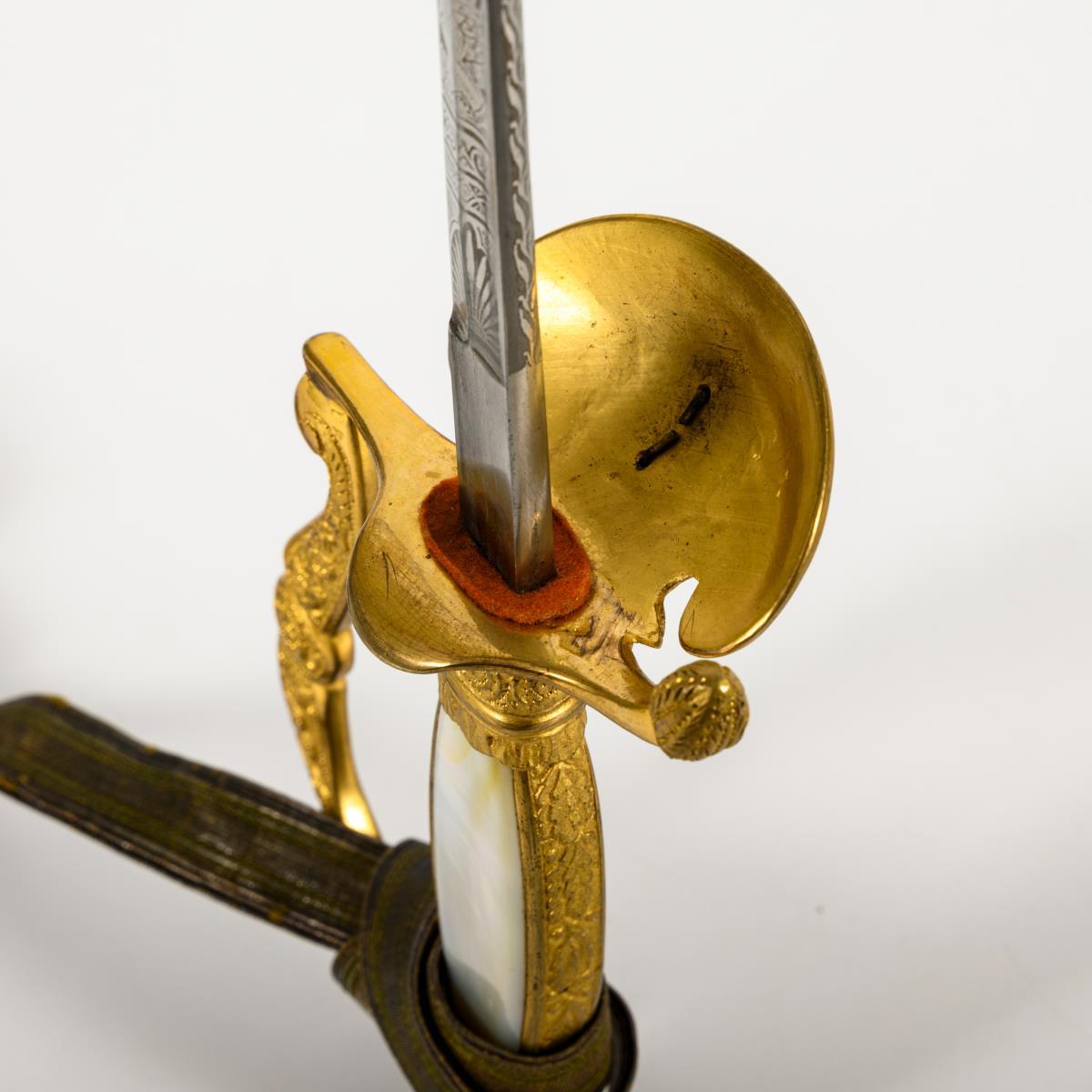 Gerade, einschneidige Klinge mit Hohlschliff und Spitze in der Mittellinie. Hälftig mit Ätzmuster dekoriert. Reich reliefiertes Messinggefäß mit Perlmuttgriff. Auf dem Stichblatt sächsisches Wappen als Applikation. Schwarze Lederscheide mit Palmettknauf. Portepee.