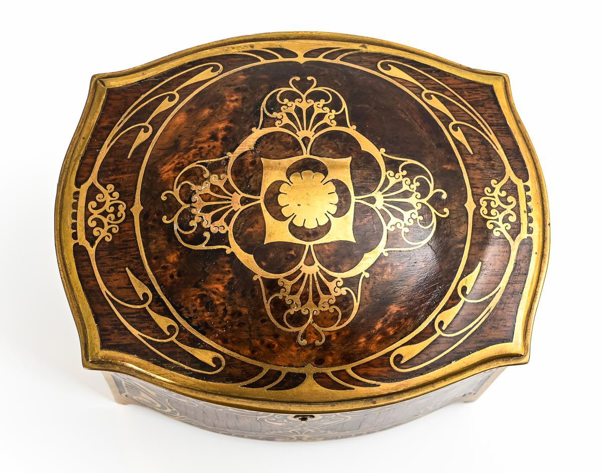 Allseits gebauchte Schatulle mit gewölbtem Scharnierdeckel. Allseits und auf dem Deckel eingelegtes Ornament im Kontrast vom Goldton zum dunklen Holz. Innen dunkelblauer Samt. Minimale Alters-/Gebrauchsspuren.