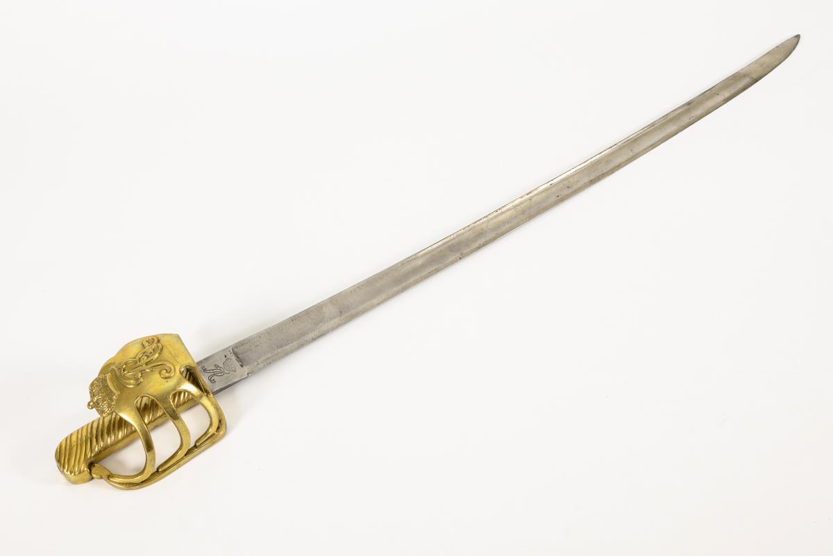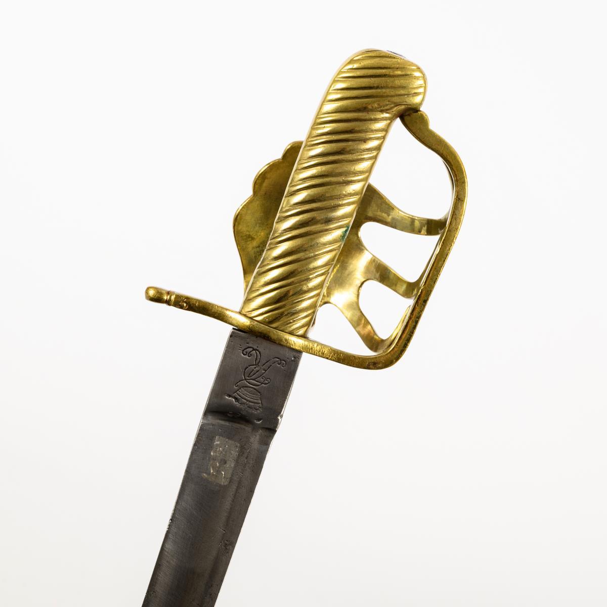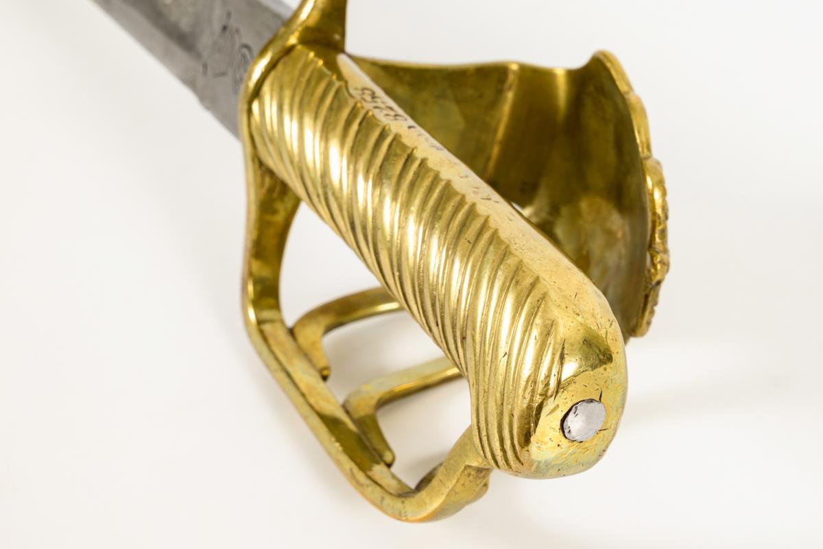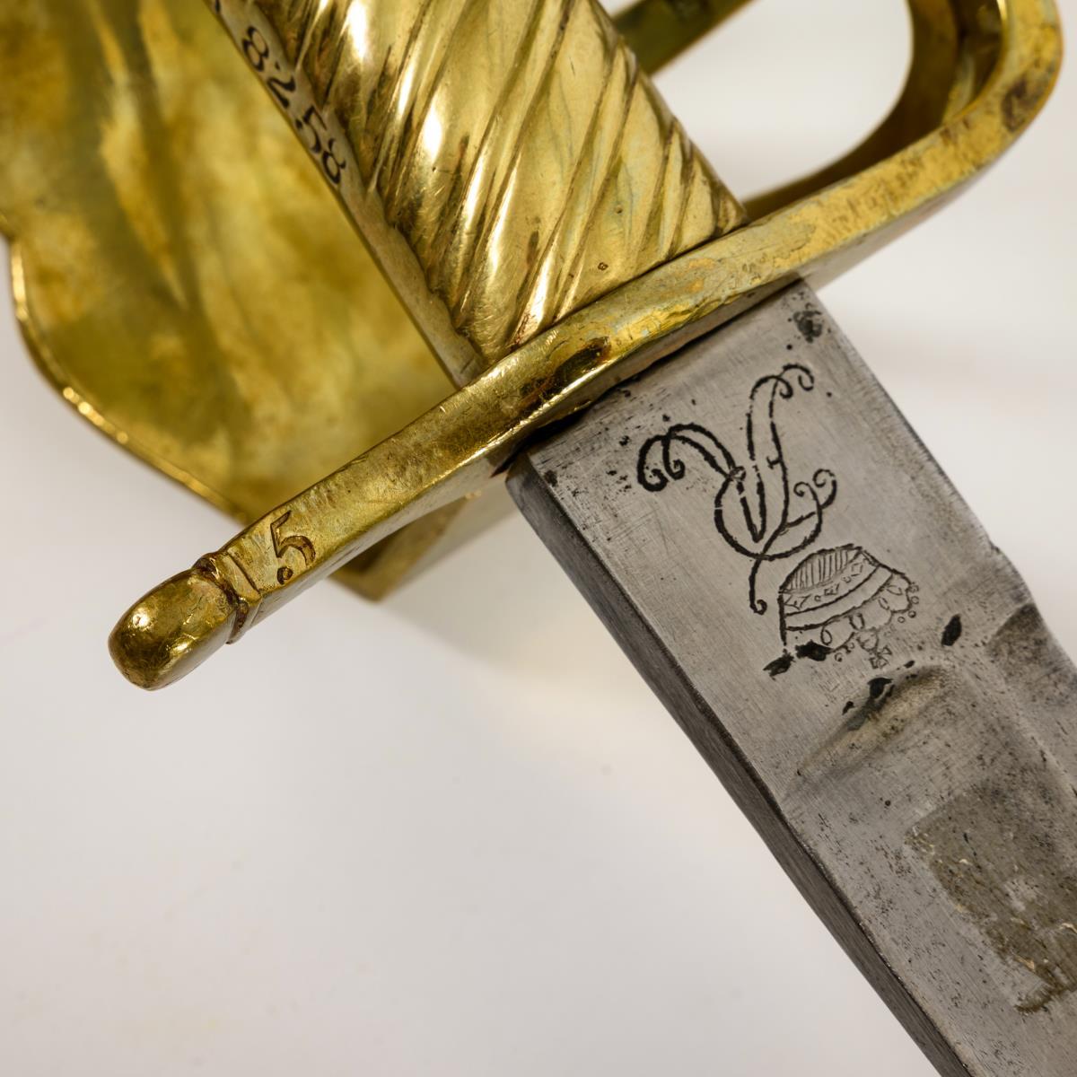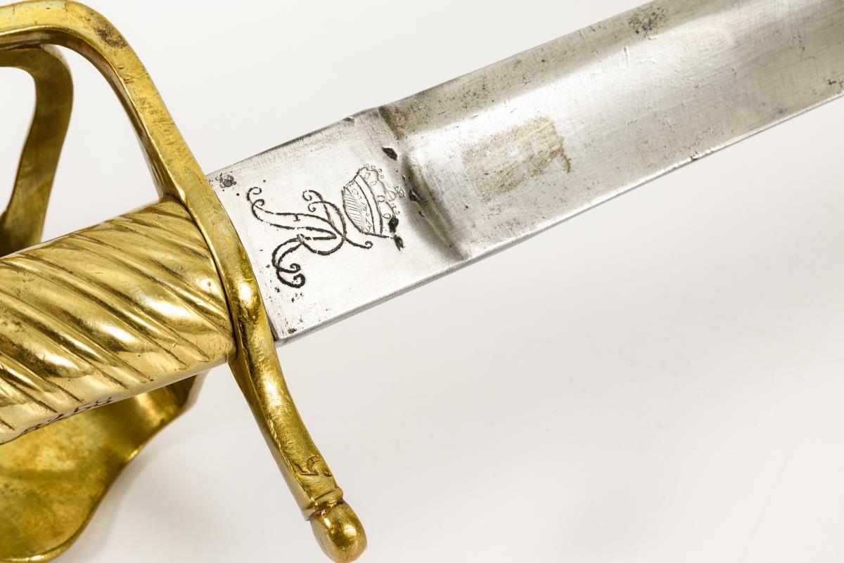 Schwach gekrümmte, einschneidige Klinge mit breitem Hohlschliff und weiterem, schmaleren und tiefen Hohlschnitt in der Rückenlinie. Auf der Fehlschärfe bekröntes Monogramm "FAR". Messinggefäß mit dreispangigem Korb und reliefiertem Königsmonogramm "FAR". Griff schräg gerippt, mit breiten und schmalen Rippen. Im Griffrücken teils verputzte Punzierung "...8258".