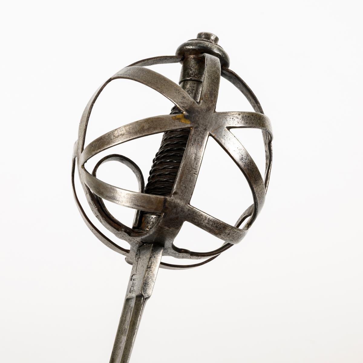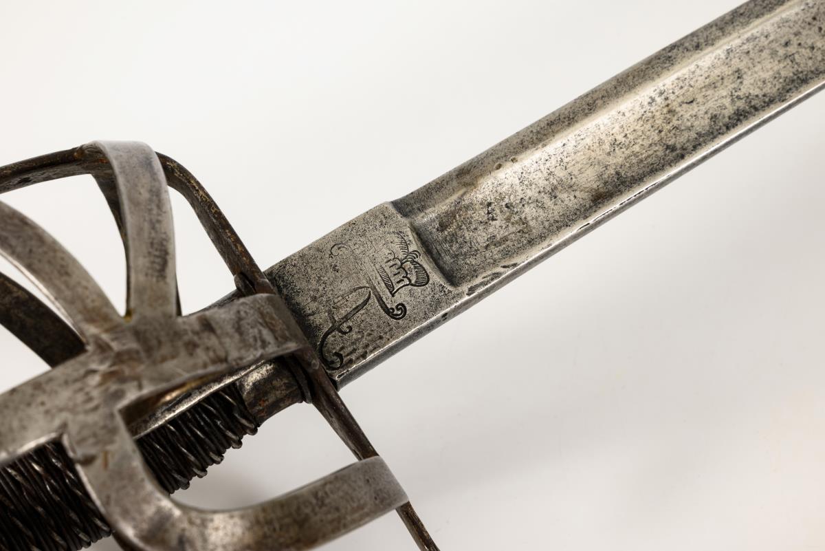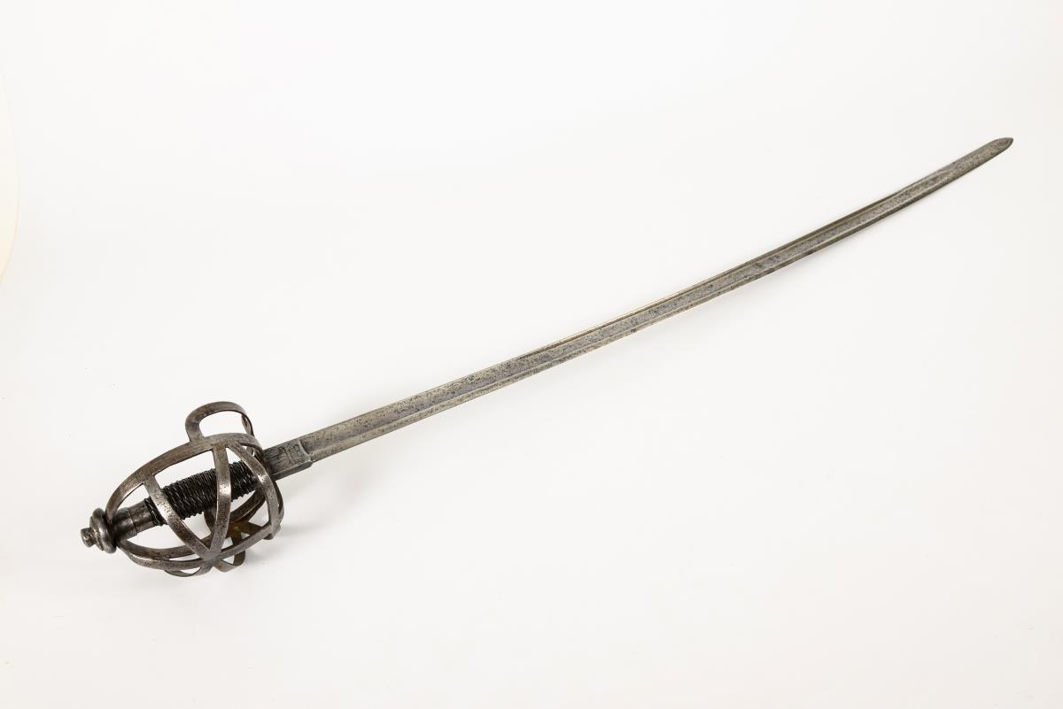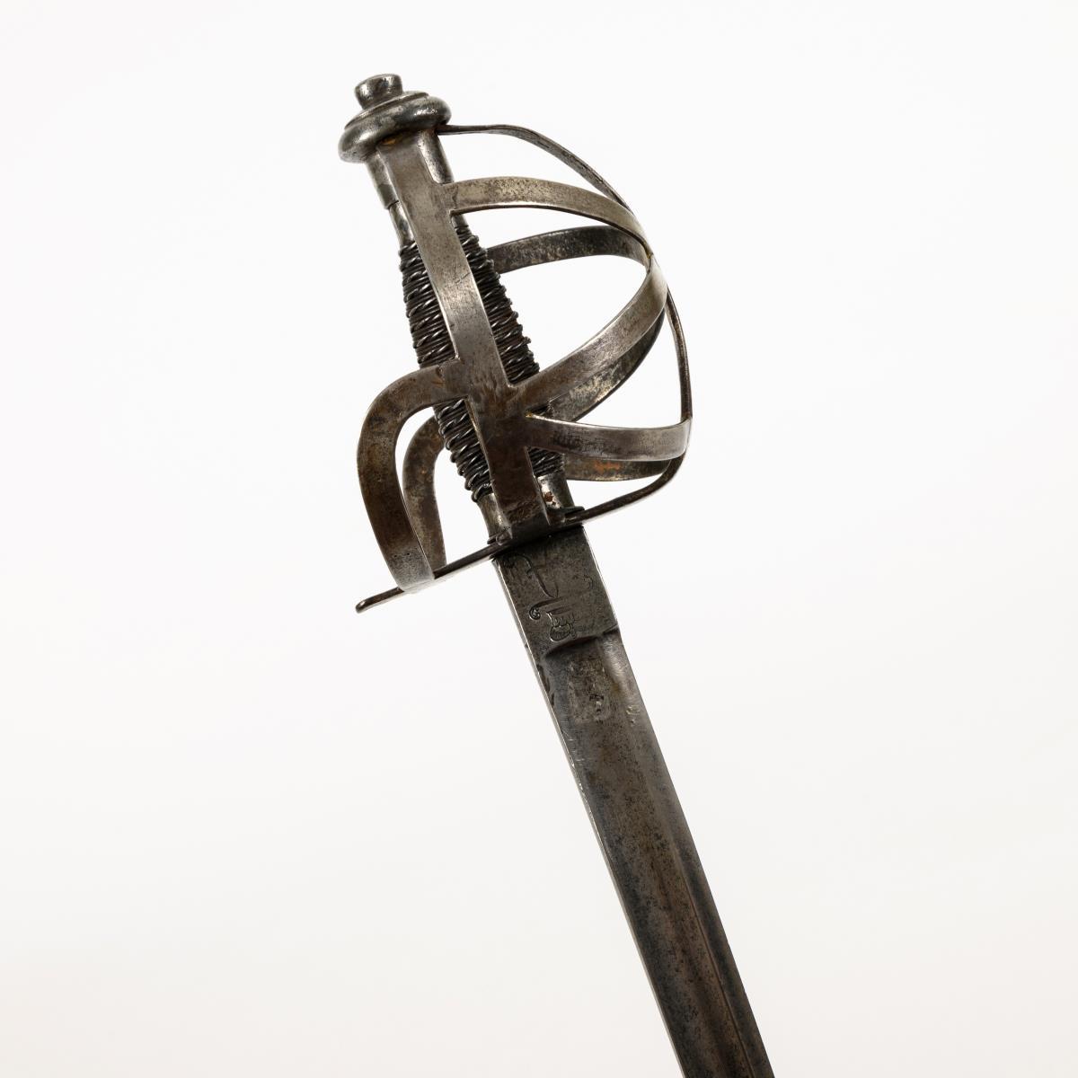 Leicht gekrümmte, einschneidige Klinge mit breitem Hohlschliff. Auf der Fehlschärfe Monogramm "FA" mit Kurhut. Mehrspangiger Eisenkorb mit Daumenring, Drahtwicklung aus zwei glatten und einem verdrillten Draht. Alte Reparatur- oder Verarbeitungsstellen am Eisenkorb.