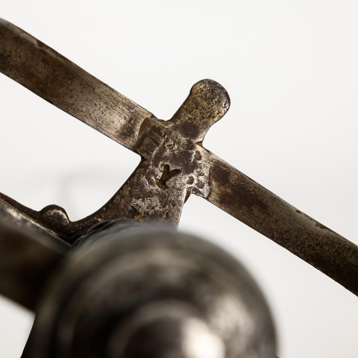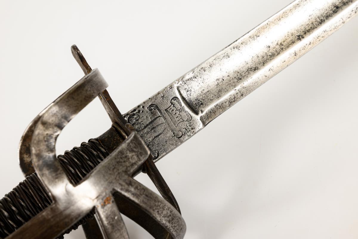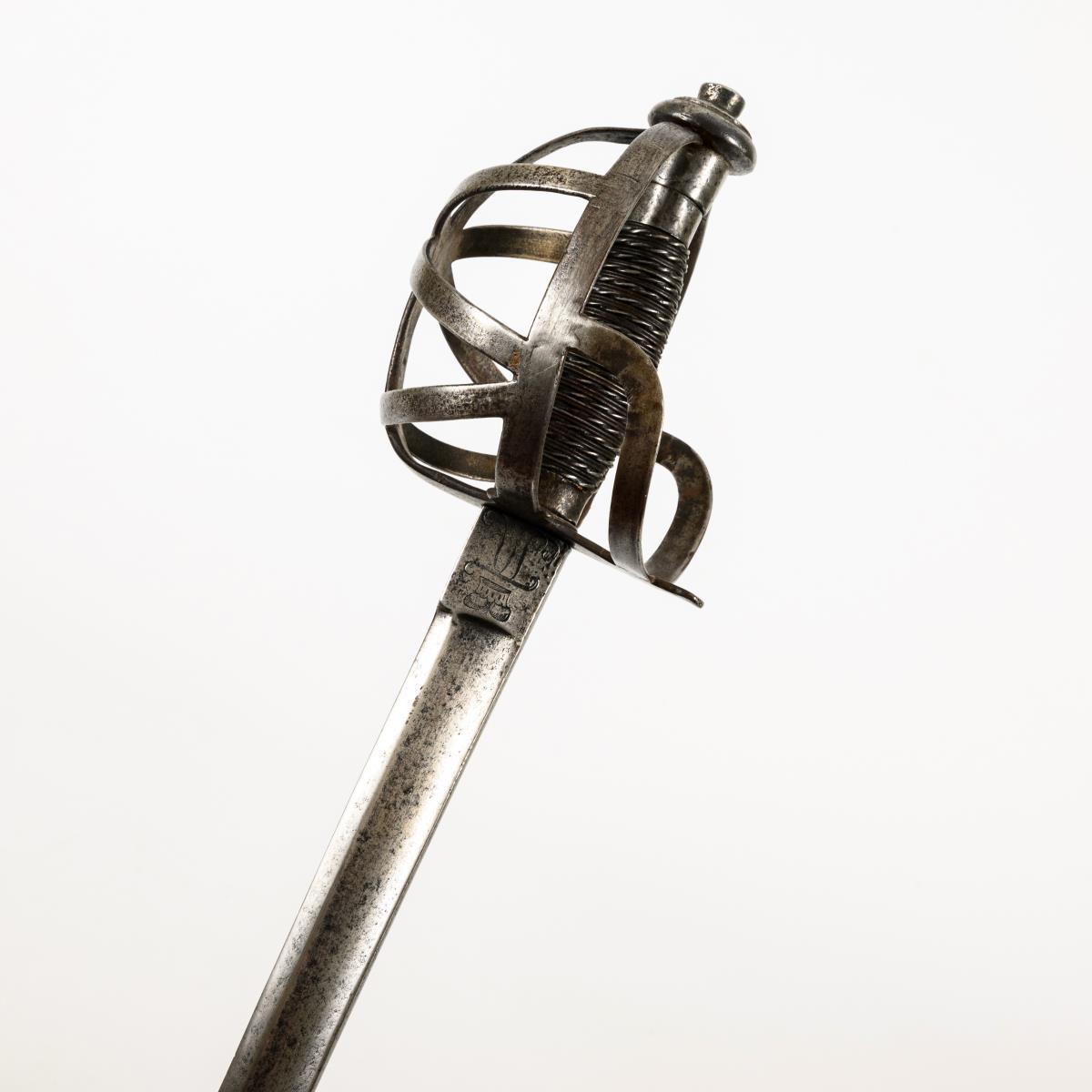 Leicht gekrümmte, einschneidige Klinge mit breitem Hohlschliff. Auf der Fehlschärfe Monogramm "FA" mit Kurhut. Mehrspangiger Eisenkorb mit Daumenring, Drahtwicklung aus zwei glatten und einem verdrillten Draht. Alte Reparatur- oder Verarbeitungsstellen am Eisenkorb.