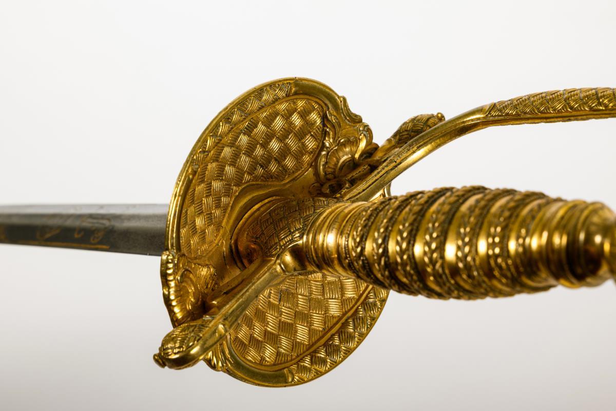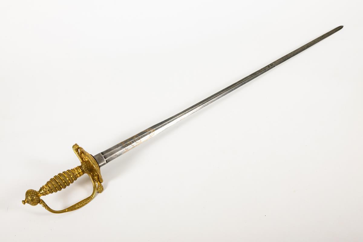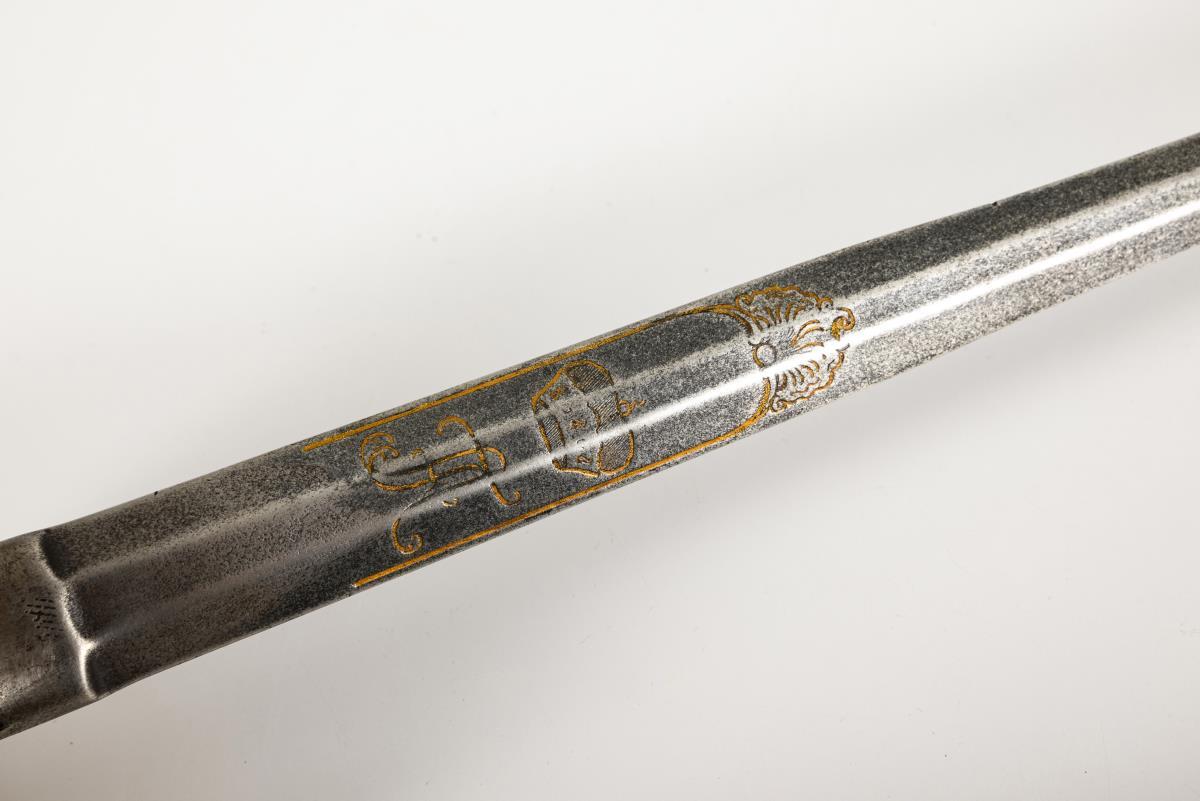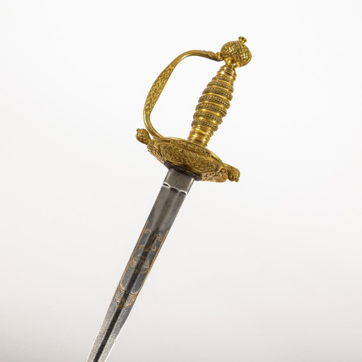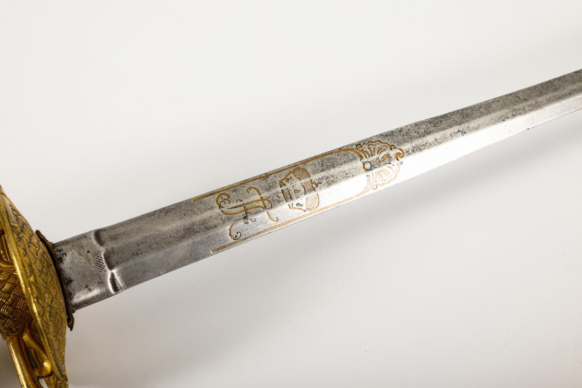 Gerade zweischneidige Klinge mit sechskantigem Querschnitt. Graviertes und vergoldetes Monogramm "FA" mit Kurhut auf beiden Seiten. Tellerartiges Stichblatt. Dieses sowie Kugelknauf, Parierstangenenden und Bügel mit reliefiertem Flechtmuster. Gegossener Griff mit imitierter Wicklung.