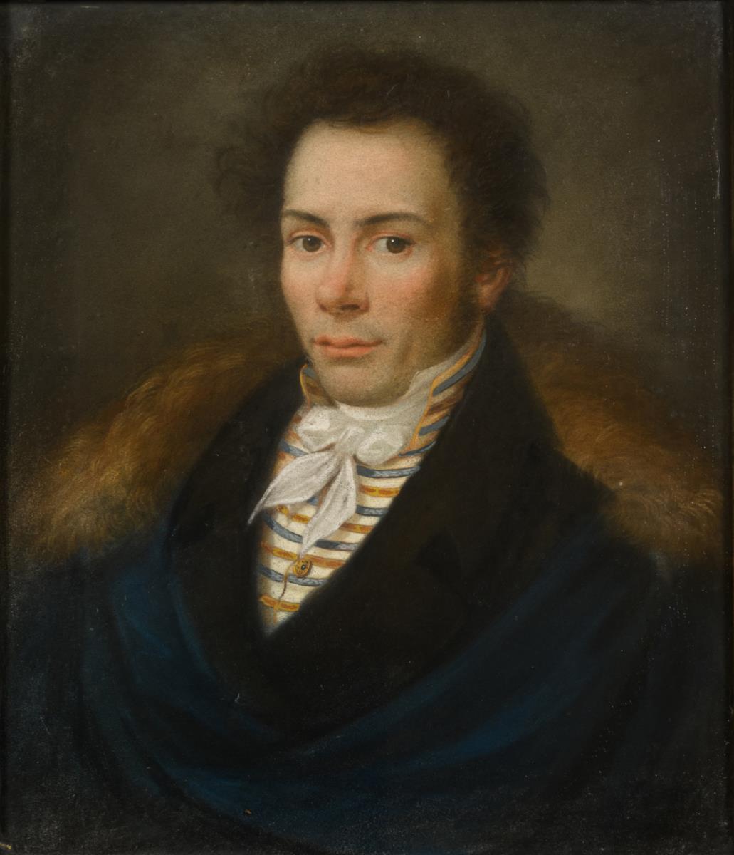 Porträt eines jungen Mannes im blauen Gehrock mit Pelzkragen.