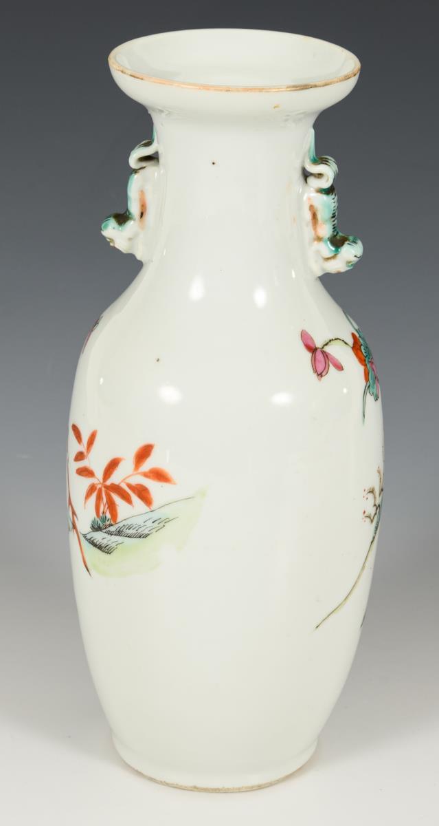 Balustervase mit kleinen Handhaben. Spielende Kinder als Motiv. H 24 cm. Aufkleber: "Ching Dynastie 1736 - (1796)". / Mehrpassige, flache Schale mit etwas beriebener, figürlicher Bemalung. Rhombenförmiger Fußsockel mit Wellenornament. Unterseite mit Fledermaus- und Pfirsich-Bemalung. Ausfuhrsiegel. 5 x 28 x 22 cm.