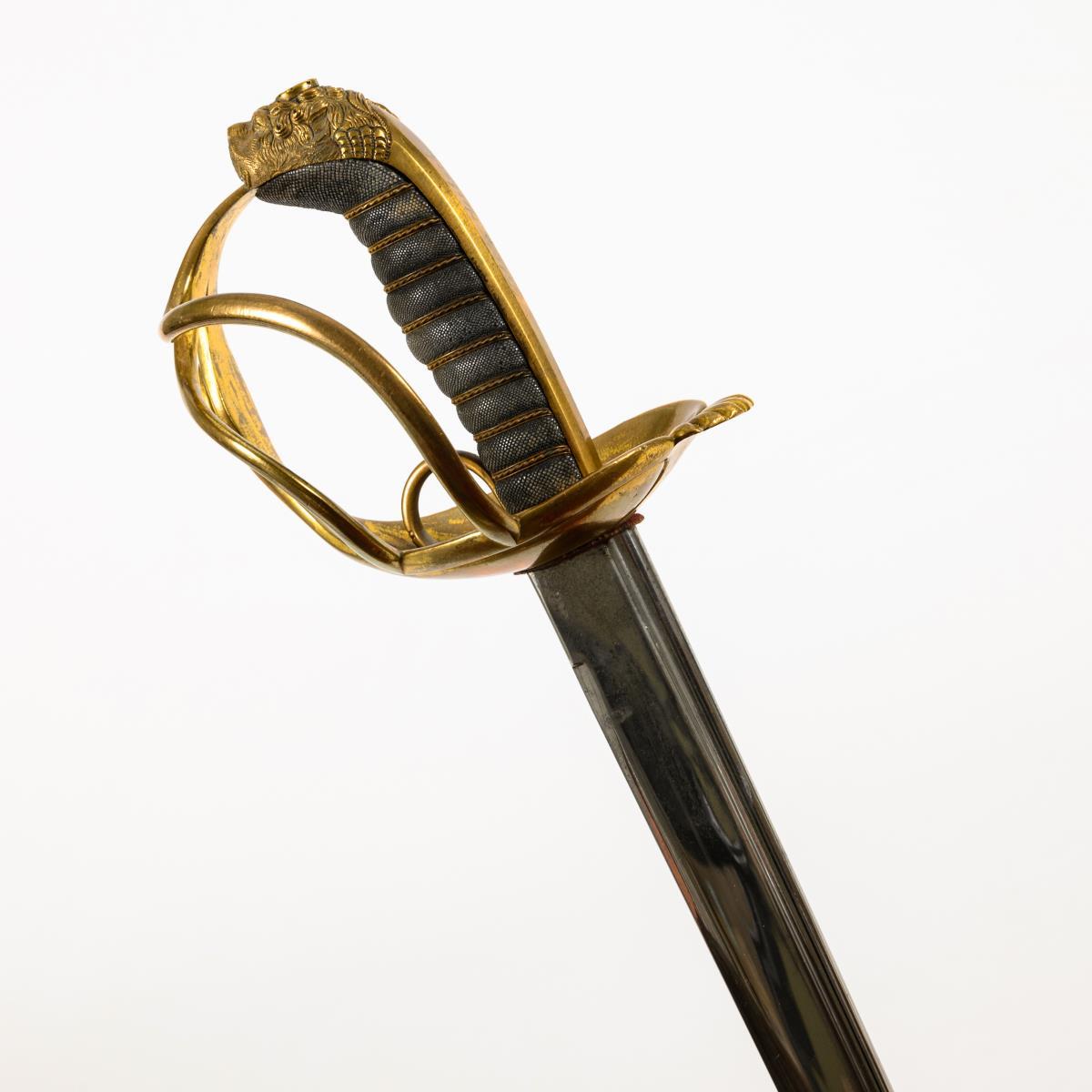 Gerade, einschneidige Klinge mit Steckrücken, langem Schör und der Spitze in der Mittellinie. Breite Fehlschärfe, dort gemarkt. Gefäß aus Messing, zweispangig mit bekröntem sächsischen Wappen auf dem Bügel. Fischhautgriff mit fein ausgearbeitetem Löwenkopf, inclusive der Tatzen. Niete mit sternförmigen Schraubenschlitzen. Stichblatt herzförmig und gewölbt, mit Palmettenabschluss, Daumenring. Auf Griffrücken "Frhr. von Seebach". Blanke Scheide mit zwei starren Griffringen und eckiger Öse.