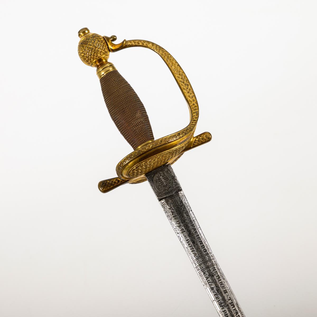 Gerade zweischneidige, reich verzierte Klinge. Fehlschärfe mit gekreuzten Klingen bzw. sächsischem Wappen, jeweils bekrönt vom Kurhut. Im ersten Viertel Klinge mehrpassig und beschriftet: "Nec temere nec timide, recte faciendo neminem timeas, tandem bona causa triumphat" (teils undeutlich), sowie bekrönter Adler und Monogramm "AR". Messinggriff mit feiner Kupferdrahtwicklung. Gefäß mit herzförmigem Stichblatt in Flechtoptik..