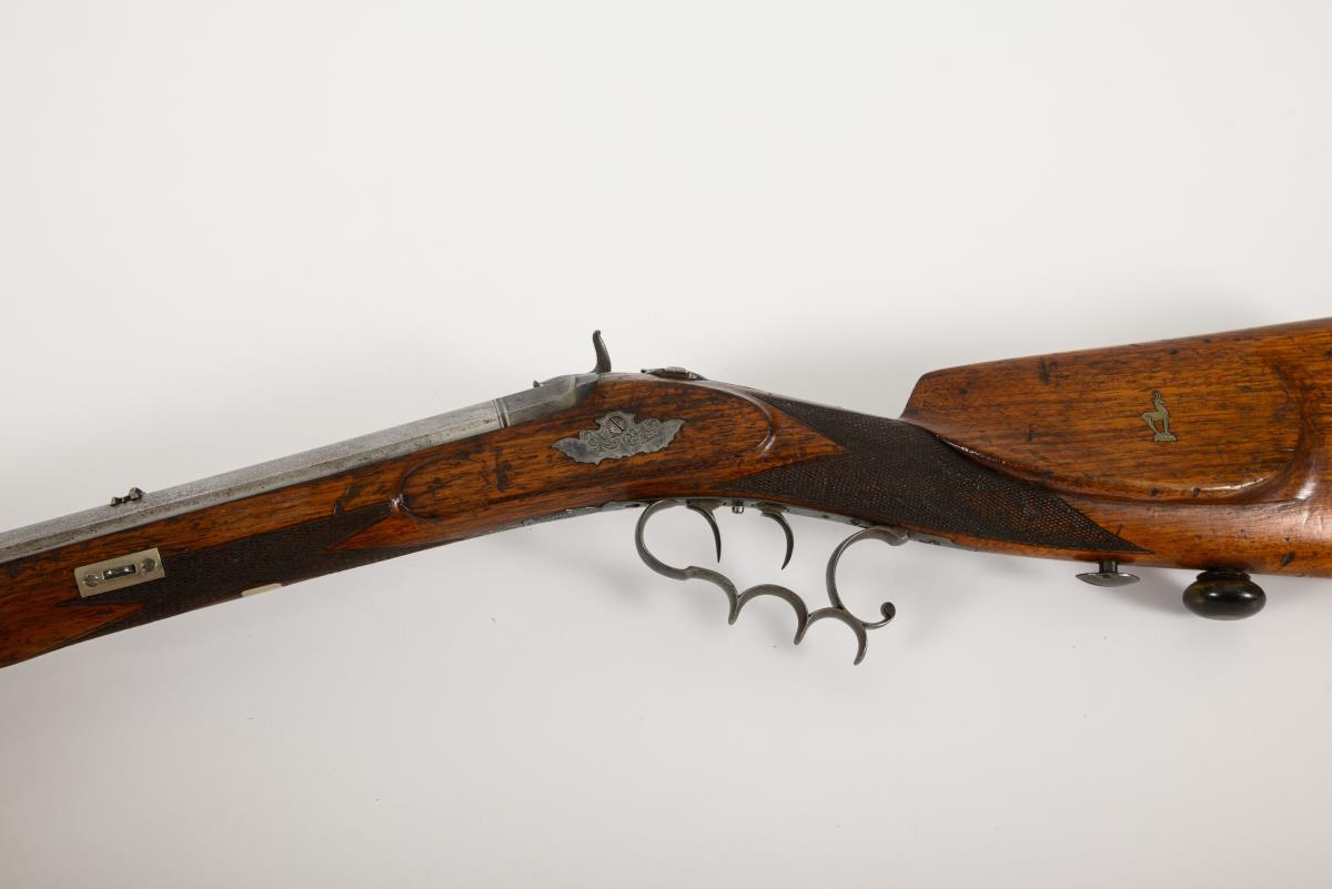 Achtkantiger, gezogener Lauf, signiert. Kimme und Korn und aufstellbares Lochvisier. Fein mit Arabesken reliefierter Abzug mit Stecher und Harfengriff. An der Wangenauflage eingelegter Steinbock. Schaftmündung, Ladestockhalter und Kolbenfach mit Hirschhornstücken ausgeführt. Holzschaft mit altersgemäßen Gebrauchsspuren, Zündnadel etwas gestaucht, keine Funktionsprobe.