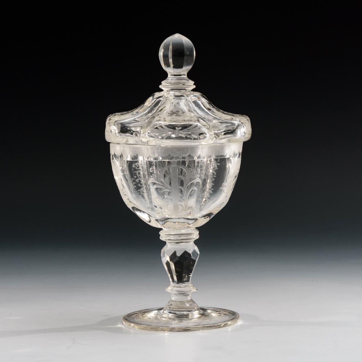 Vierpassige Kuppa und Deckel mit Kugelknauf, wabenfacettierter Balusterschaft mit Scheibennodi. Spannungsriss im Deckel.