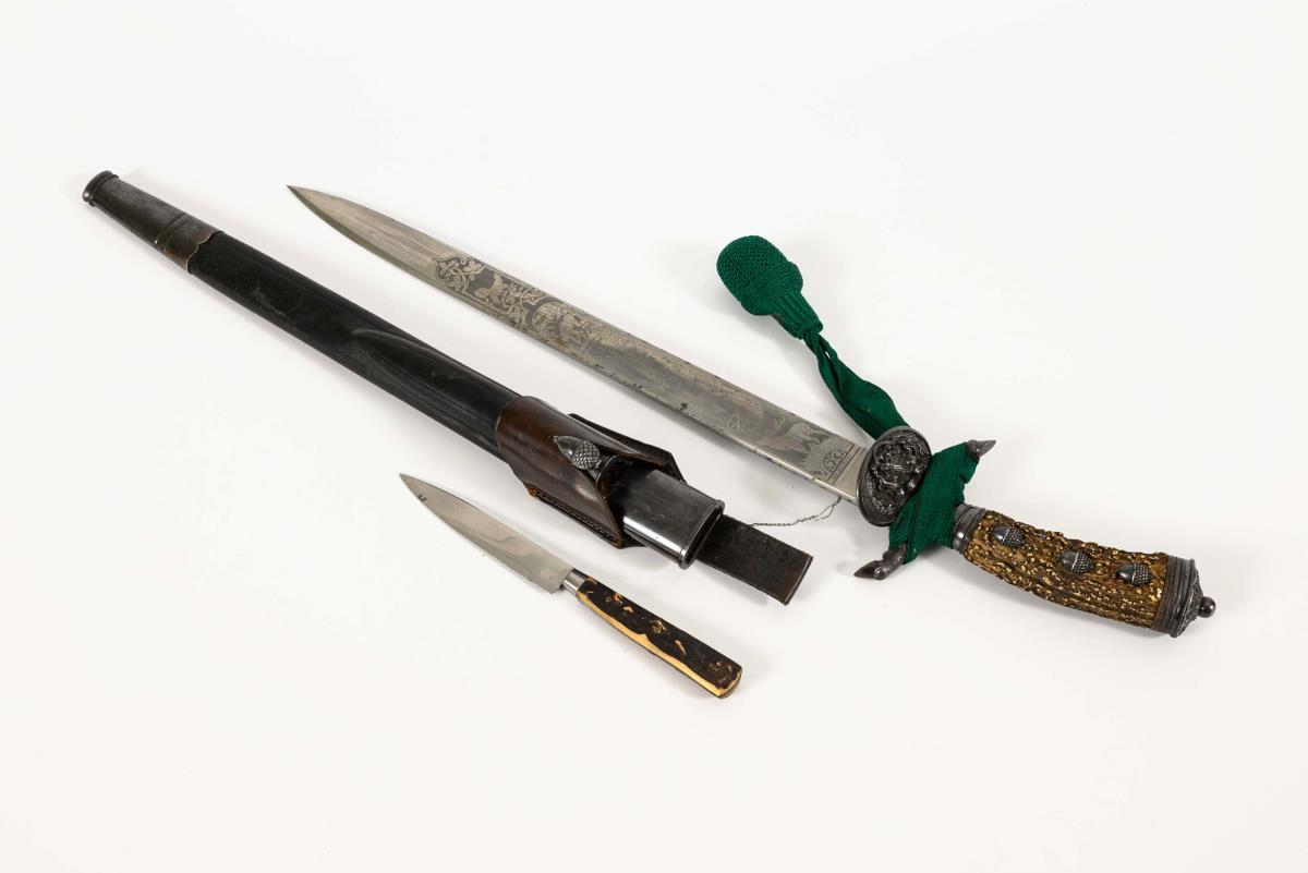 Gerade, einschneidige Klinge mit Spitze in der Mittellinie. Beidseitig mit geätzten Bildmotiven von Hirsch- und Wildschweinjagd. Parierstange als Hufe ausgebildet. Auf dem abgewinkelten Stichblatt reliefiertes sächsisches Wappen. Leicht gebogener Hirschhorngriff mit drei Nieten in Eichelform. Schwarze Lederscheide und Holster mit Beimesser. Grünes Portepee.