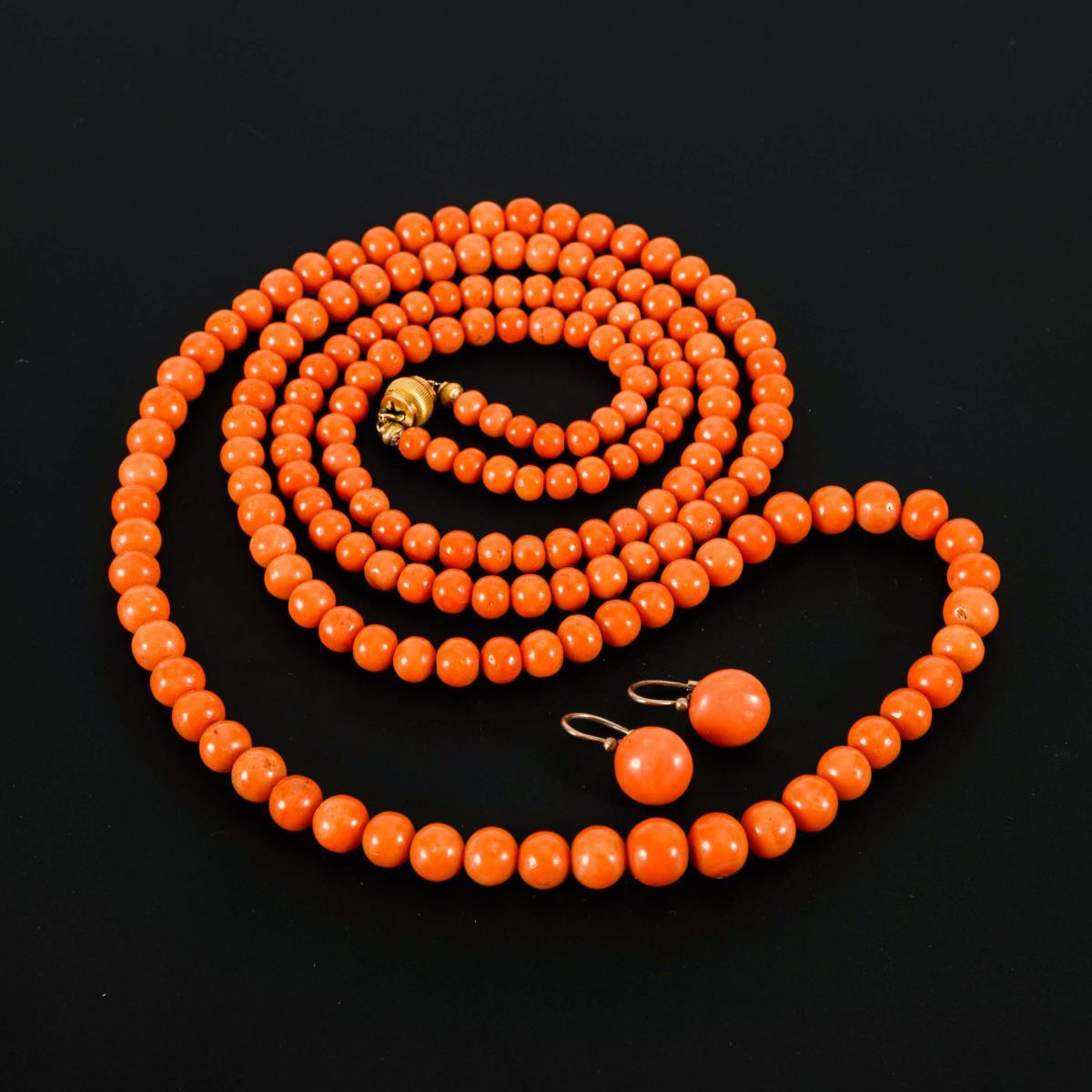 Schnürkette mit Korallen im Verlauf, an kleiner Kugelschließe. Ohrhänger mit Korallenlinse, an Bügelsteg.