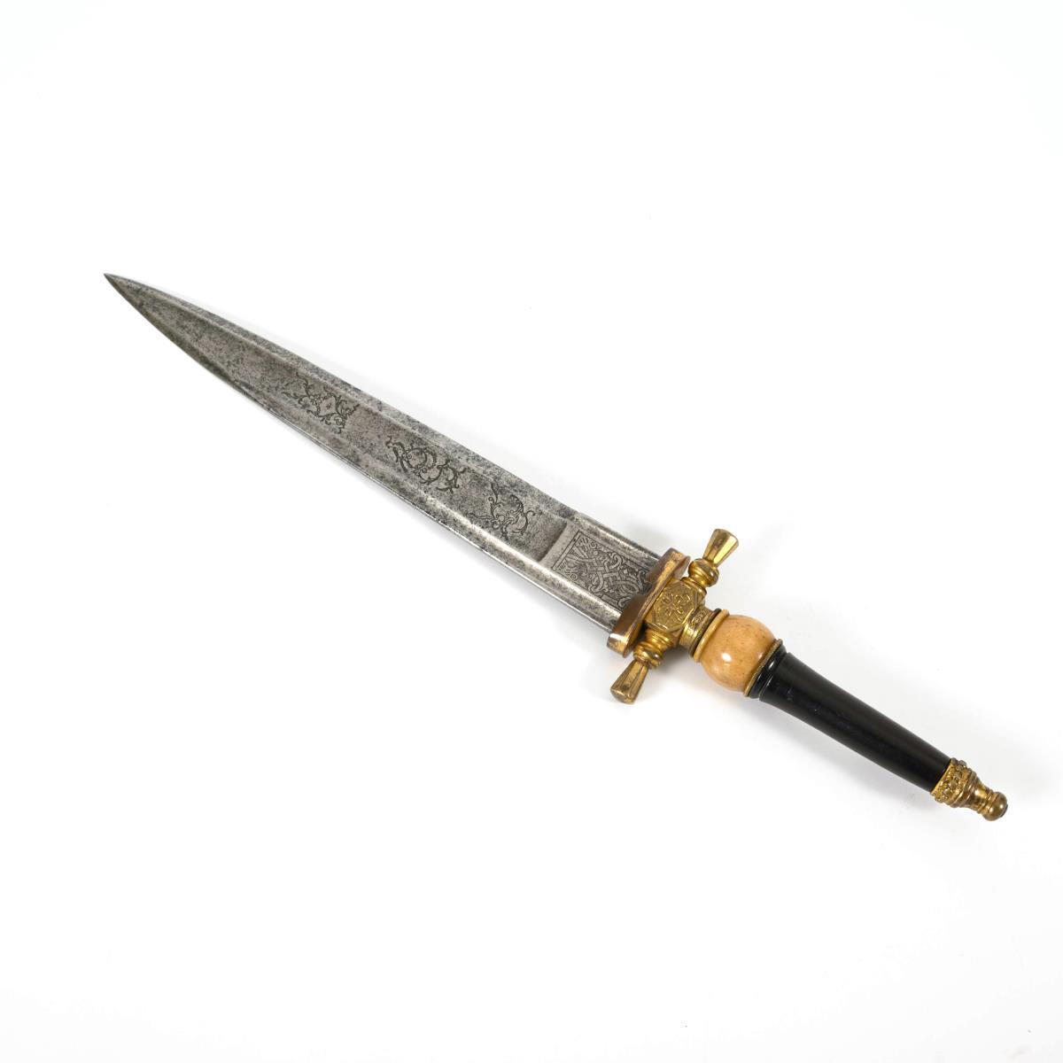 Gerade einschneidige, in der Spitze zweischneidige Klinge, mit Spitze und breitem Hohlschliff in der Mittellinie, sowie schmalem Hohlschliff am Rücken. Große Fehlschärfe, barocke Ornamente mit Vogel, gerade, gegliederte Parierstange. Griff zweigeteilt aus hellem und dunklem Holz.