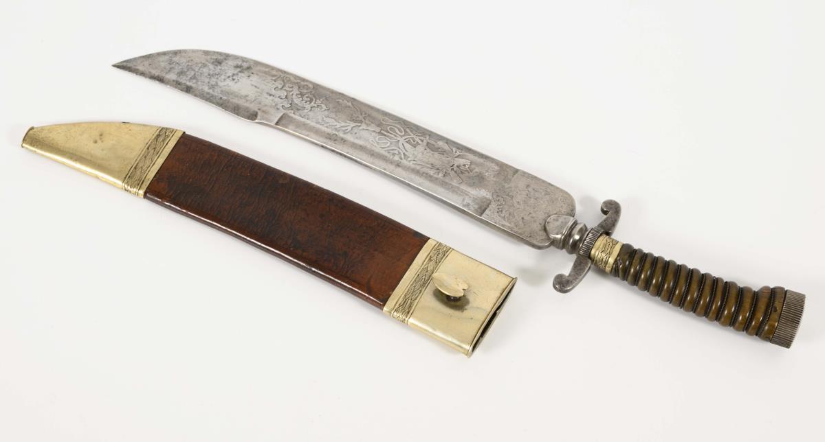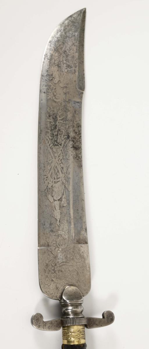 Breite einschneidige, in der Spitze zweischneidige Klinge mit Spitze in der Rückenlinie. Breite Fehlschärfe. Großflächige Ornament- und Bilddarstellungen. Kurze Parierstange, Gerippter Griff aus Horn mit einfacher Drahtwicklung. Ovales Knaufende. Braune Lederscheide mit verzierten Metallkappen.