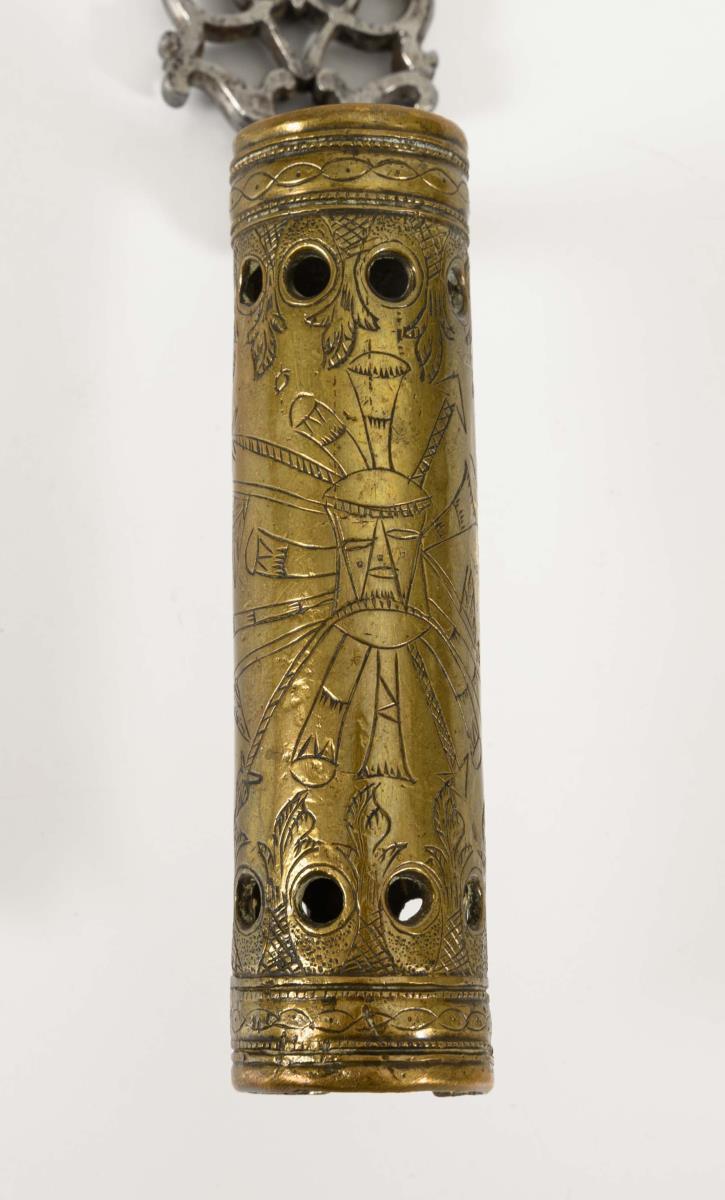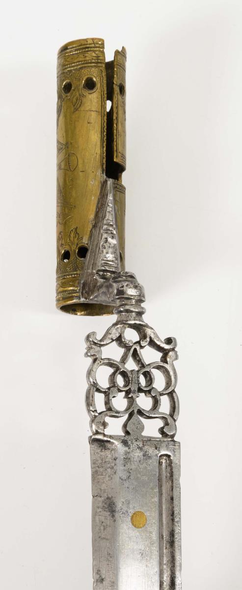 In der Spitze zweischneidige Klinge, mit Haken und schmalem Hohlschliff auf einer Teilseite. Durchbrochen gearbeitete Fehlschärfe. Tülle aus Messing, mit graviertem Trophäenstück. Wohl für den jagdlichen Gebrauch. Holzscheide mit Messingfassung und verblichenem, rotem Stoffbezug. Altersgemäß sehr gute Erhaltung.