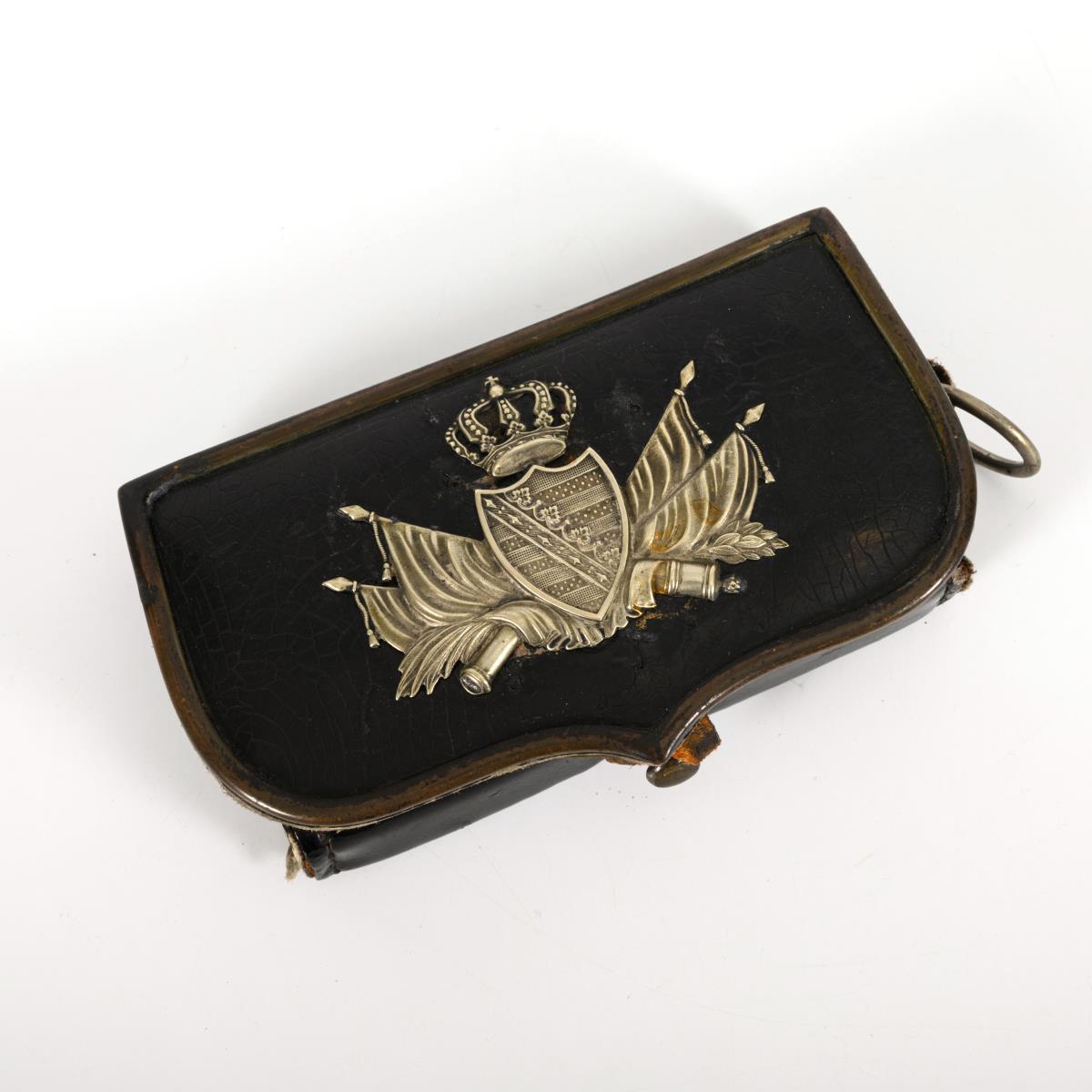 Schwarzes Leder mit Metallumrandung und Wappenapplikation. Seitliche Befestigung fehlt bzw. jünger ergänzt. Innen Holzklotz, damit das Leder nicht einfällt, Verschluss defekt. Alters- und Gebrauchsspuren.