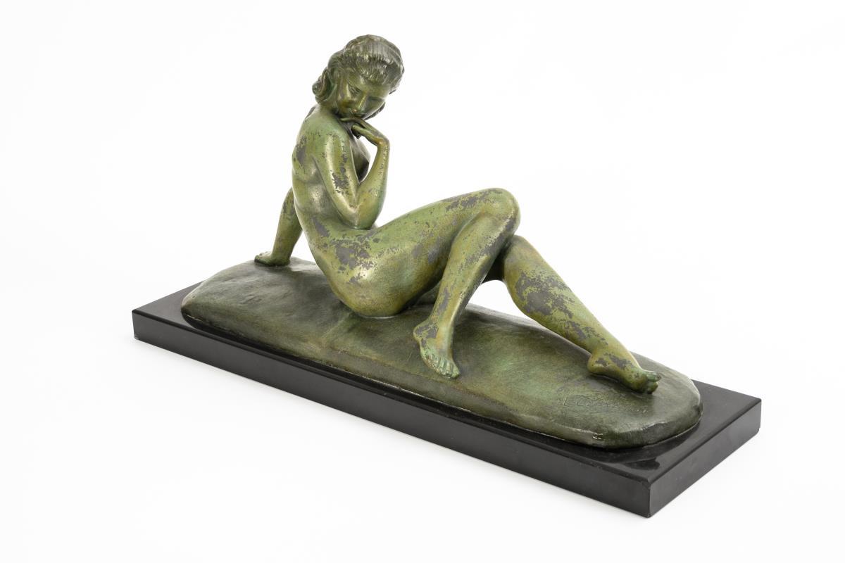 Metallguss grün gefasst, schwarze Marmor-Plinthe. Bezeichnet. H 25 cm, gesamt 28 x 55 x 16 cm. 12,7 kg.