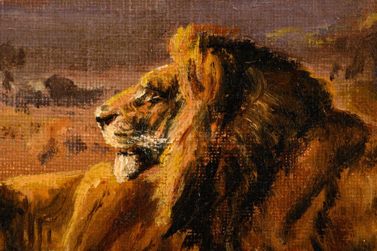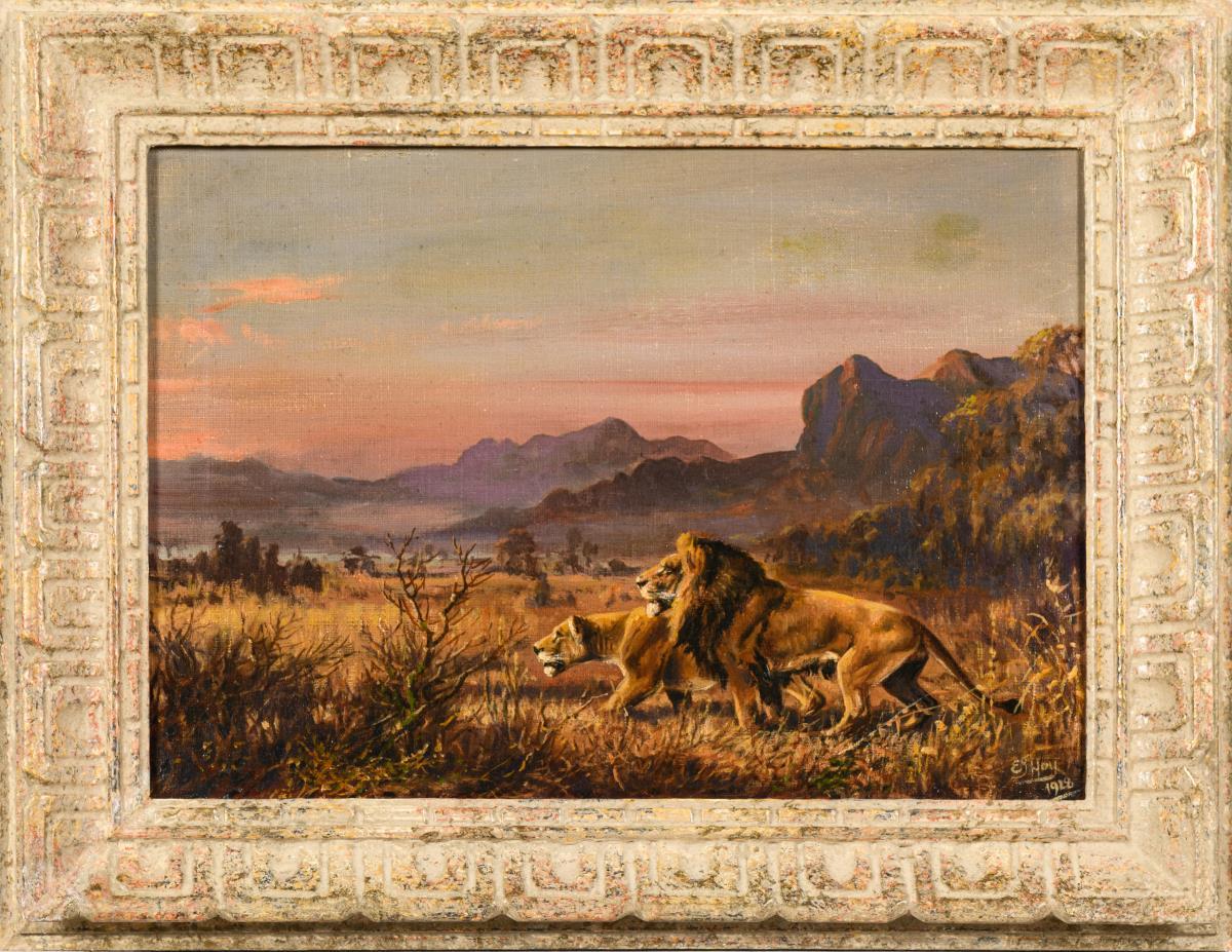 Die beiden Tiere in beginnender Lauerstellung am Waldrand vor den Bergen. Leichte Altersspuren.