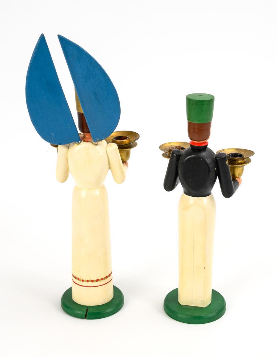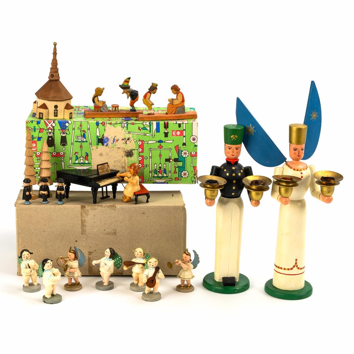Leuchter-Engel und Leuchter-Bergmann (H 30/24 cm), 8 musizierende Engelchen (teils in der Art von Wendt & Kühn), Flügel, 3 kleine Kurrende-Figuren (H 4 cm), 2 Märchen-Szenen und 3 Teile jüngeres Holzspielzeug. Altersspuren, teils Defekte und Fehlstellen, 1 Flügel lose.