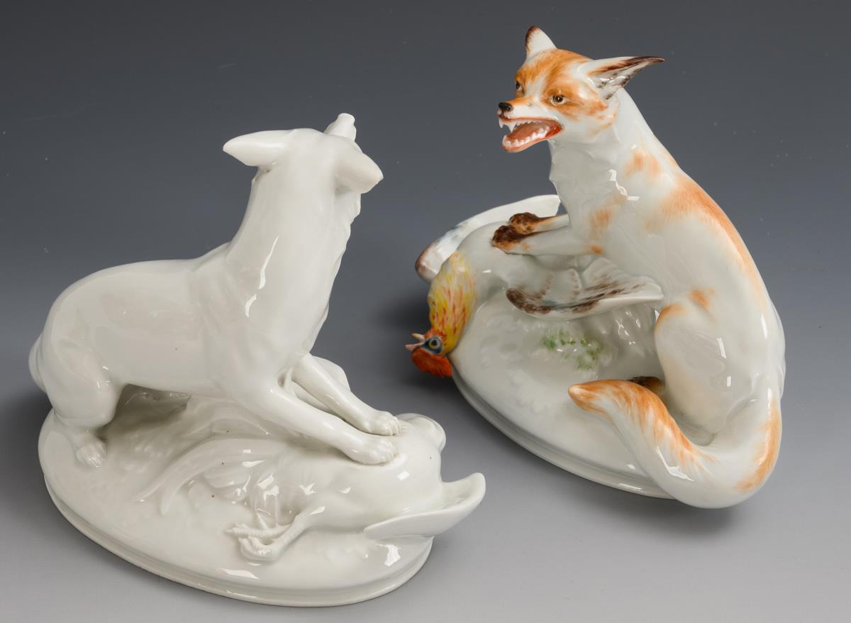 Auf einem Ovalsockel sitzender Fuchs mit erbeutetem Hahn. 1x linkes Fuchsohr und Hahnenschnabel restauriert, 1x rechtes Fuchsohr restauriert und bestoßen.