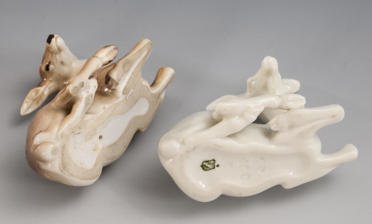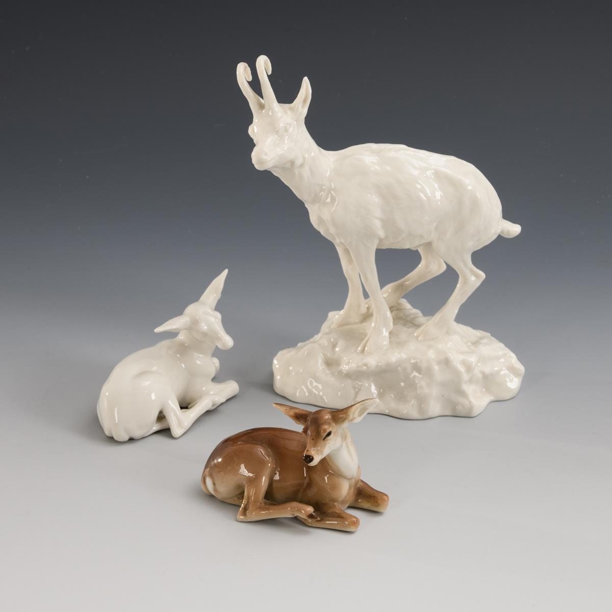 1x Modell-Nr. 515, Entwurf 19. Jh. von Sebastian Habenschaden (1813-1868), Neuausformung ab 1914: auf einem Felssockel stehender Gamsbock (H 16,5 cm). / 2x Modell-Nr. 460, Entwurf um 1770 von Dominikus Auliczek (1734-1804), 1906 überarbeitet von Theodor Kärner (1884-1966): liegende Hirschkälber (H 6 cm).