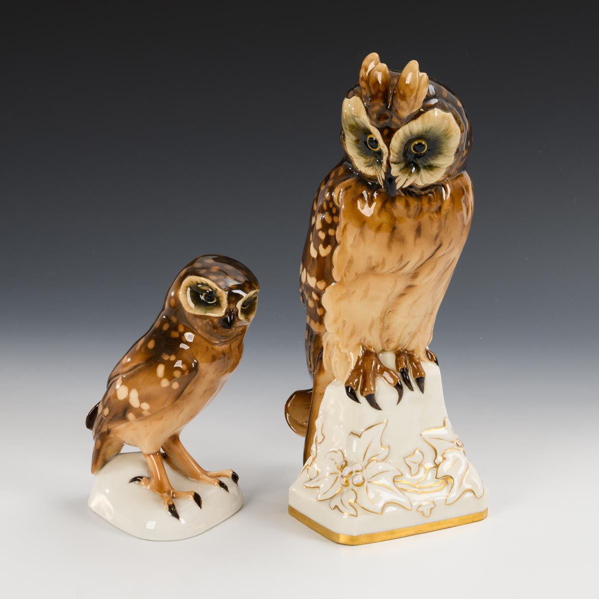 1x Modell-Nr. 28, Entwurf vor 1916 von Fritz Klee (1876-1976): Uhu/Waldohreule (H 32). / 1x Käuzchen (H 18 cm).
