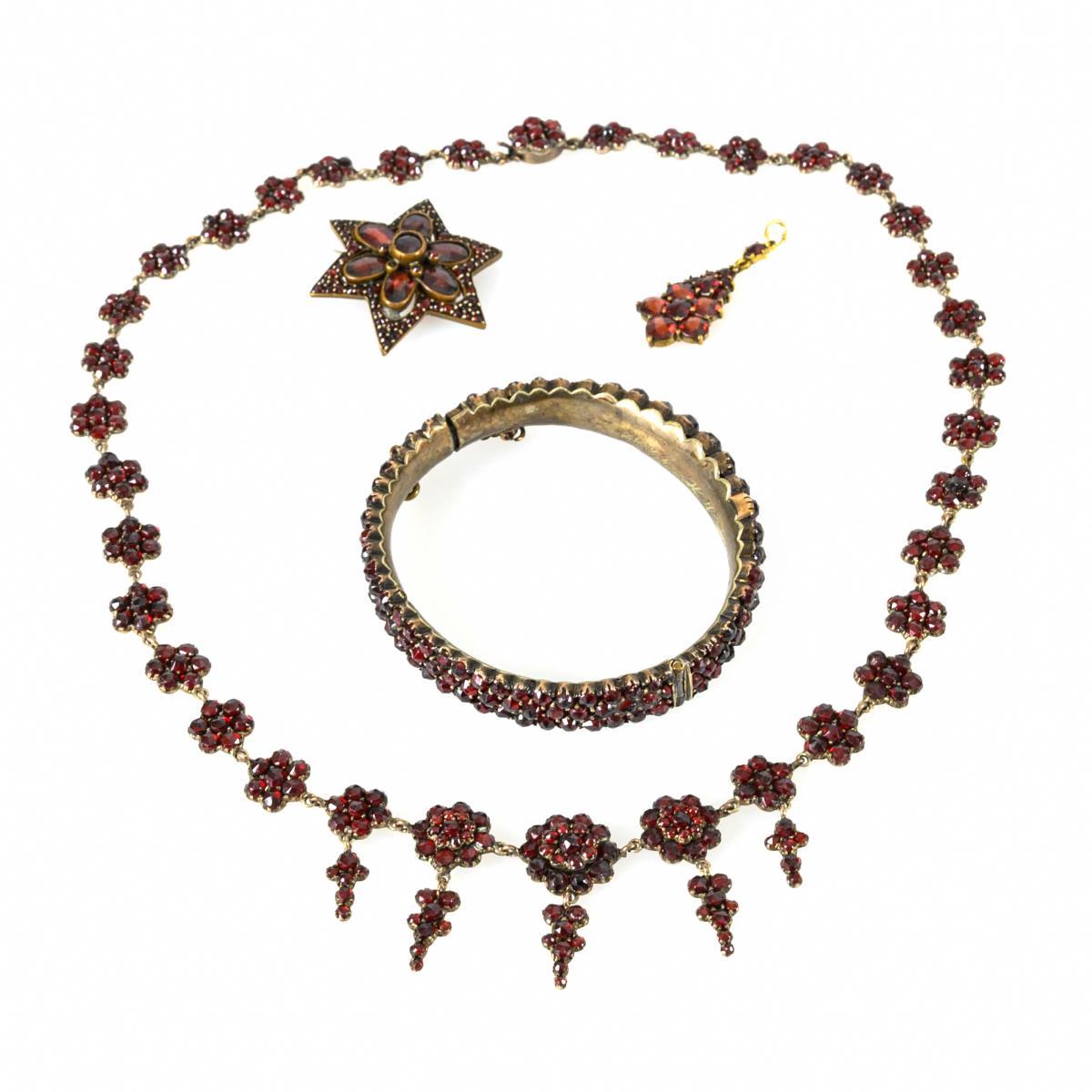 Collier mit Abhängungen (rückseitig 1 kleine Lötstelle). Ovaler Klappreif (3 Randfassungen und Kettenöse ergänzt. Innenseitig Knickstelle und kleine Delle). 3-ebnig besetzte Sternenbrosche mit Granaten (rückseitig 3 Lötstellen). Dazu 1 Granatanhänger und Etui. Kastenschlösser, Sicherheitskette, Hakenverschluss.