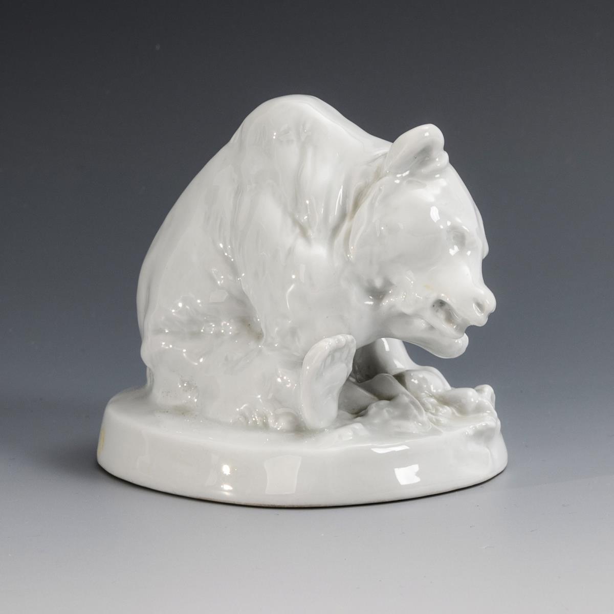 "Nach dem Tod von August Gaul (1869 – 1921) im Jahr 1921 kaufte die Meissener Manufaktur Modelle postum von dessen Erben. Ab Februar 1922 bis 1926 wurden 18 verschiedene Tiermodelle in weißem Porzellan ohne jegliche Bemalung und in Böttgersteinzeug ausgeführt. Dazu gehörte auch die Figur des kleinen, fressenden Bären, dessen Ausführung in Porzellan eine differenziertere Gestaltung zeigt als die Version in Böttgersteinzeug. Dadurch wird offensichtlich, dass ursprünglich die Modelle von Gaul nicht für eine Ausführung in keramischen Materialien konzipiert waren, sondern doch eher als Bronzeplastiken gedacht waren." (Petra Werner, in: Katalog: Auf der Pirsch - Jagdbare Tiere in Porzellan, Porzellanikon (Bd. 117), Hohenberg a.d. Eger 2015, S. 49/Kat.-Nr. 45).
