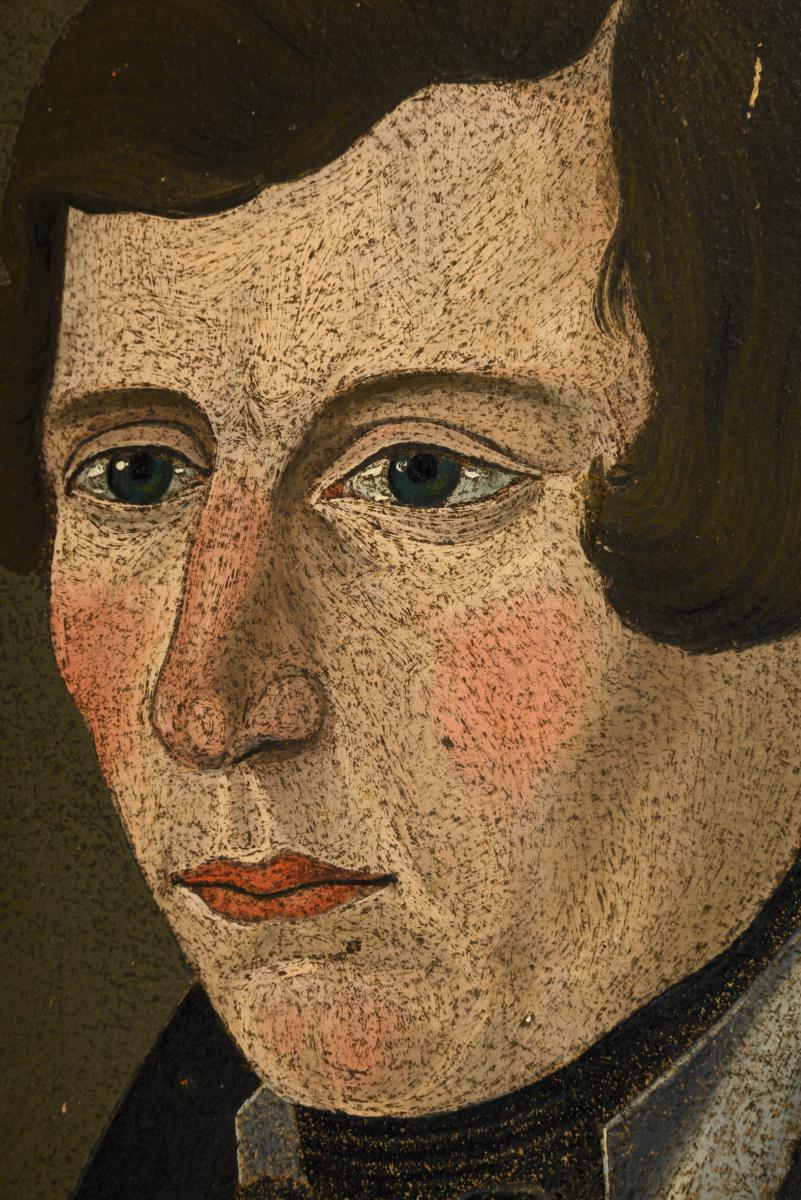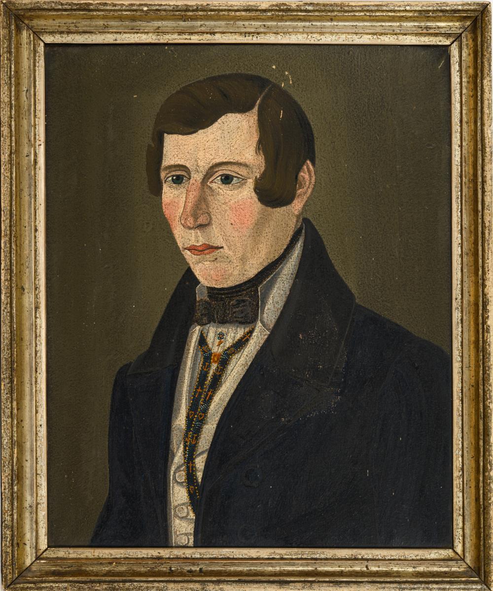 Porträt eines Mannes im dunkelblauen Gehrock vor neutralem Hintergrund. Reinigungsbedürftig.
