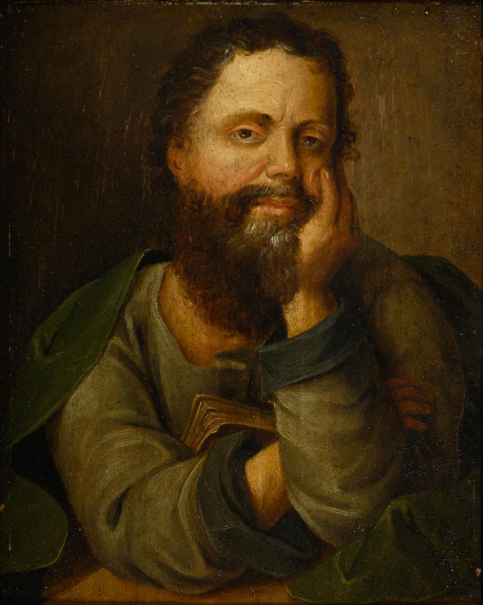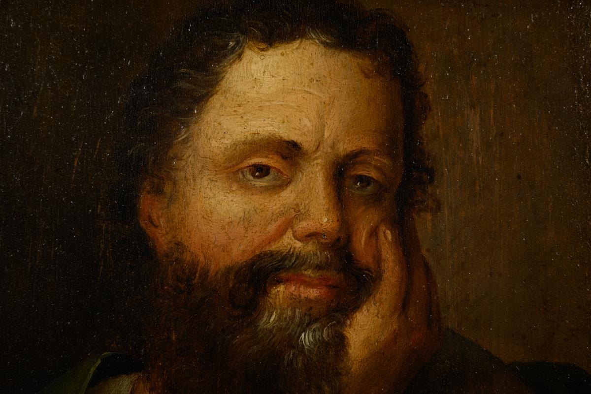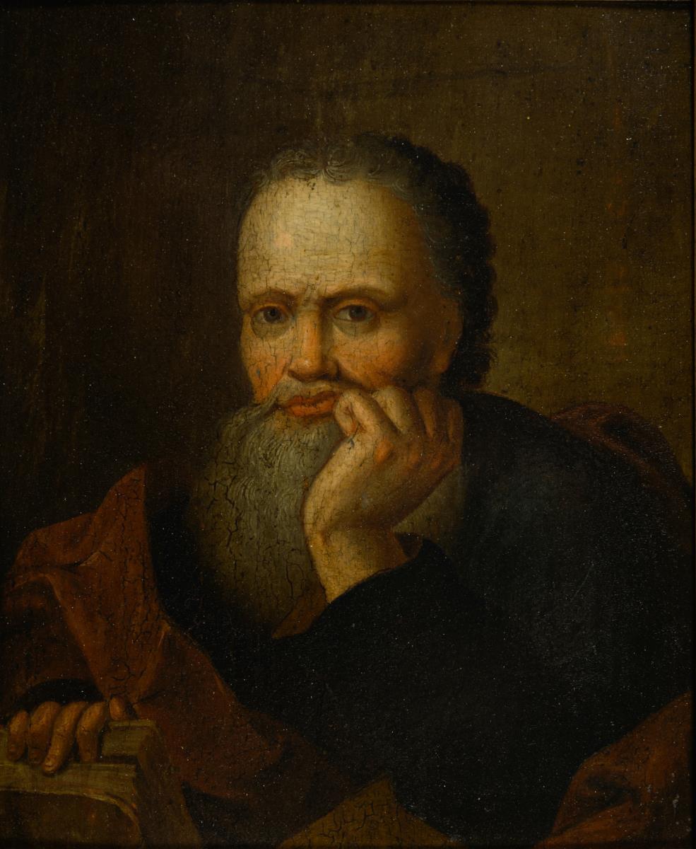 Porträts zweier älterer Männer mit Büchern und in antikisierender Kleidung. Leichte Altersspuren.