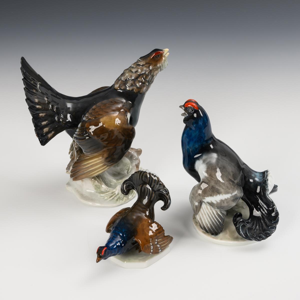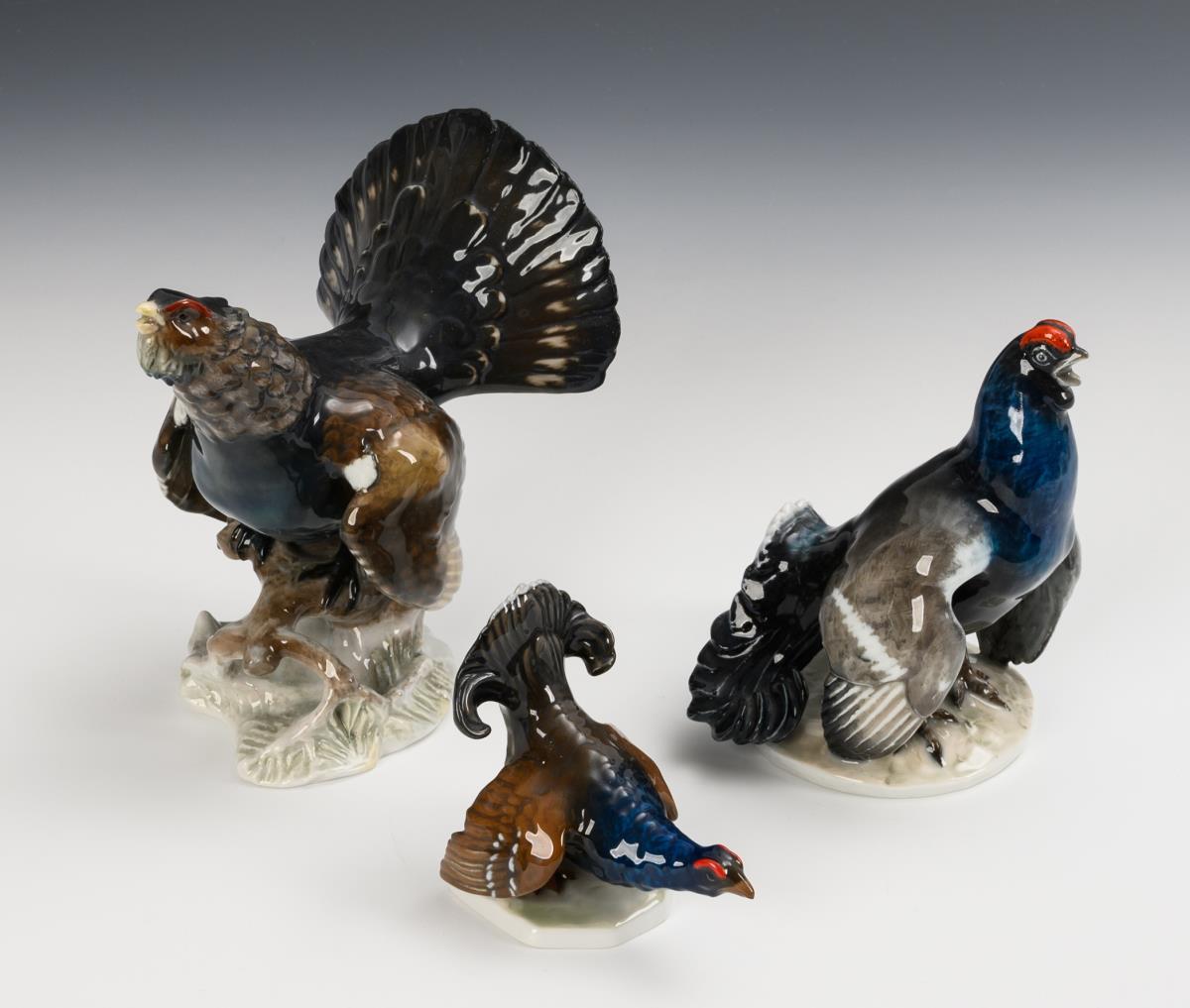 1 Auerhahn: 1x Modell-Nr. 1695, Entwurf 1938 von Fritz Heidenreich (1895-1966), bezeichnet (H 16 cm). / 2 Birkhähne: 1x Modell-Nr. 1987, Entwurf 1955 von Fritz Heidenreich, bezeichnet (H 14,5 cm); 1x Modell-Nr. K 290, Entwurf 1913 von Fritz Diller (1875-1945), monogrammiert (H 9 cm). Schnabel des Auerhahns restauriert.