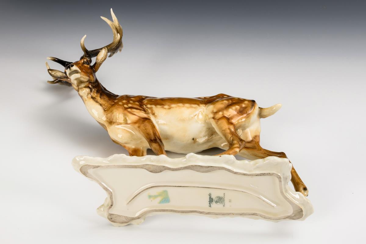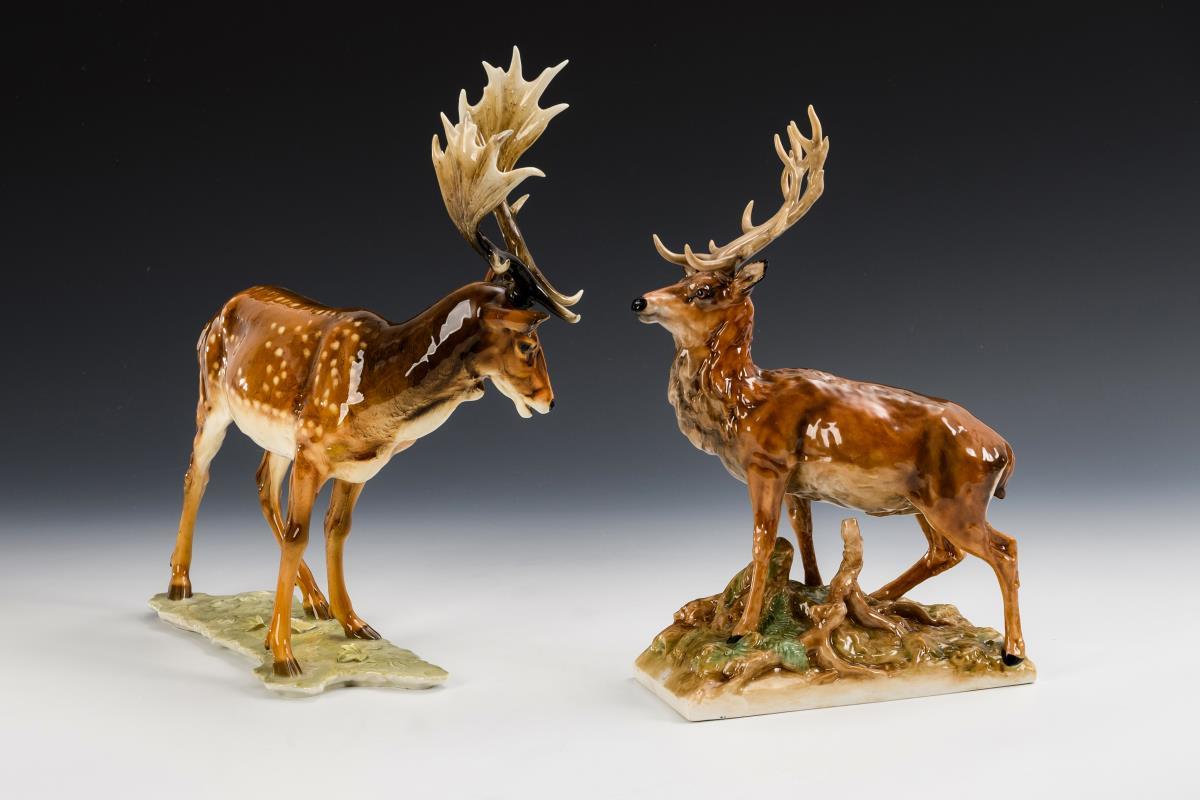 1x HUTSCHENREUTHER, ab 1955, Modell-Nr. 2828, Entwurf 1964 von Gunther Granget (1932-2010), bezeichnet: Damhirsch mit eingestecktem Geweih (H 33,5 cm). / 1x NYMPHENBURG, 20. Jh., Modell-Nr. 524, Entwurf 19. Jh. von Sebastian Habenschaden (1813-1868), Neuausformung ab 1914: auf einem Waldbodensockel stehender Hirsch (H 30 cm). 2 Spitzen einer Geweihschaufel des Damhirsches restauriert.