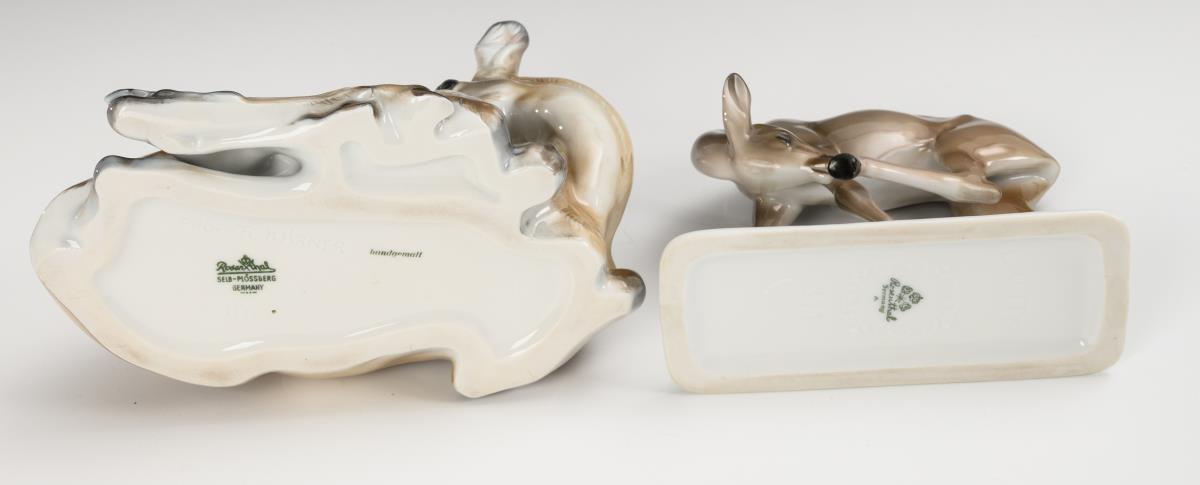 1x Ricke mit Kitz, Modell-Nr. B 1117, Entwurf nach 1953 von Theodor Kärner (1884-1966) (H 14,5 cm). / 1x Rehkitz, Modell-Nr. B 261, Entwurf um 1921/23 von Theodor Kärner (H 11 cm). / 1x Reh, Modell-Nr. B 311, Entwurf um 1924 von Lothar Otto (1893-1970) (H 12,5 cm).