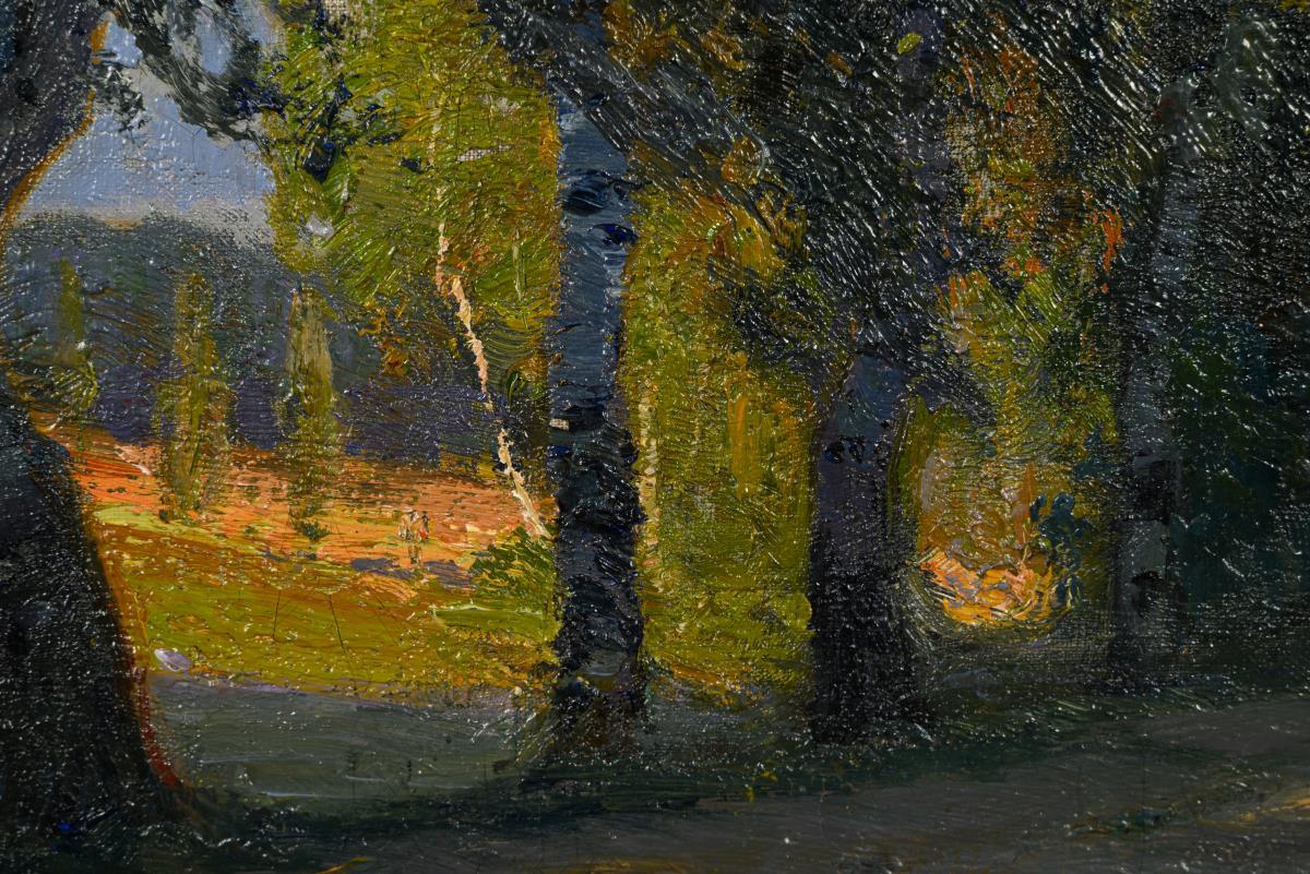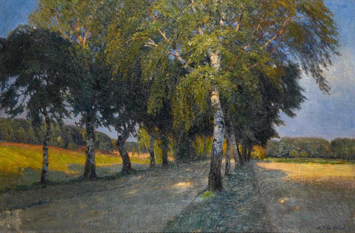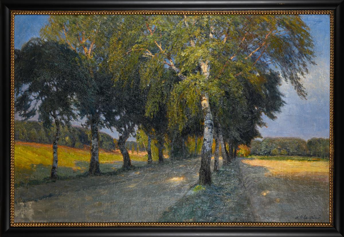 Sommerlandschaft mit breiter Straße und großen Birken mit dichten Blätterdächern nahe einem Wald. Minimale Altersspuren.