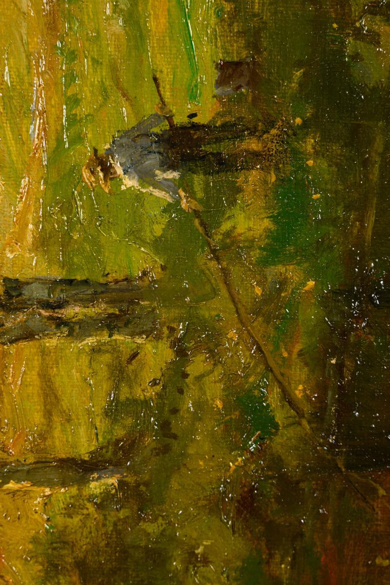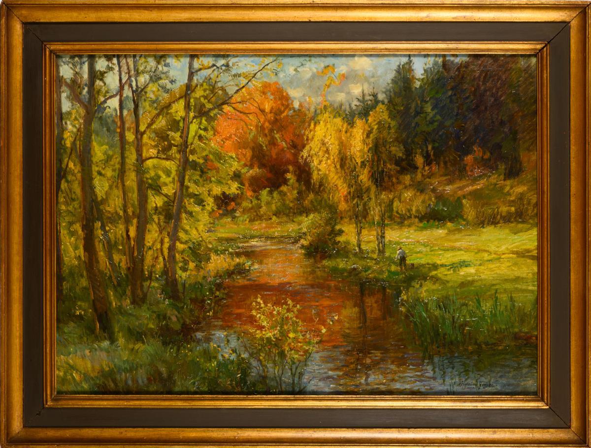 Spätsommerliche Landschaft mit Staffagefigur am Wasser im Sonnenschein. Leichte Altersspuren.