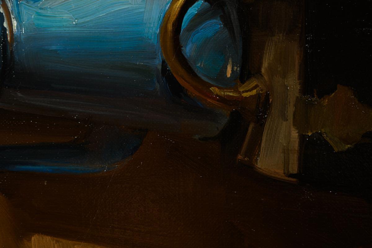 Gusseiserner Ofen mit kupfernem Teekessel, Flasche, Kanne und Stuhl.