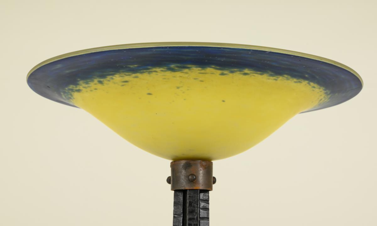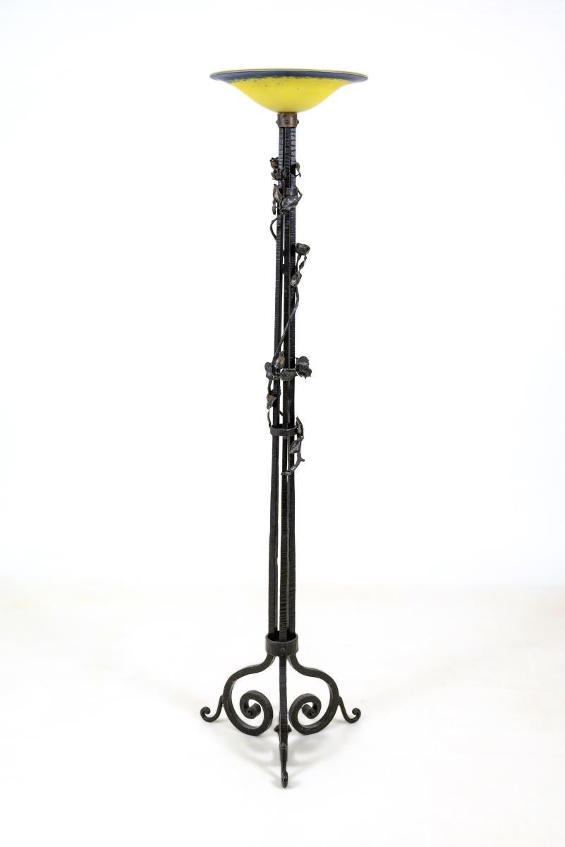 Schmiedeeisen schwarz lackiert, farbloses Glas mit gelben und blauen Pulvereinschmelzungen, 4 Bajonettfassungen. H 180 cm, Ø 40 cm.