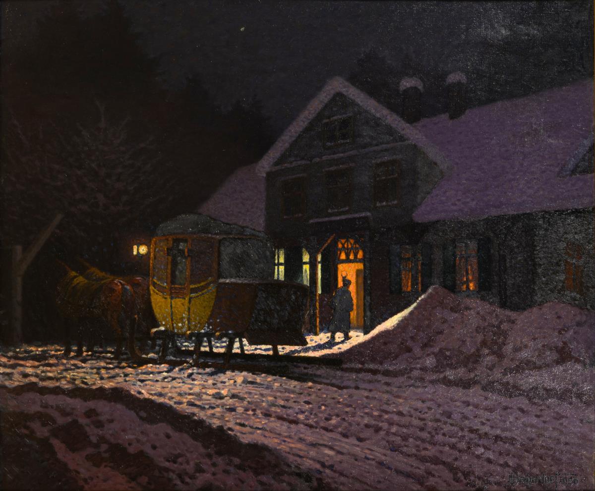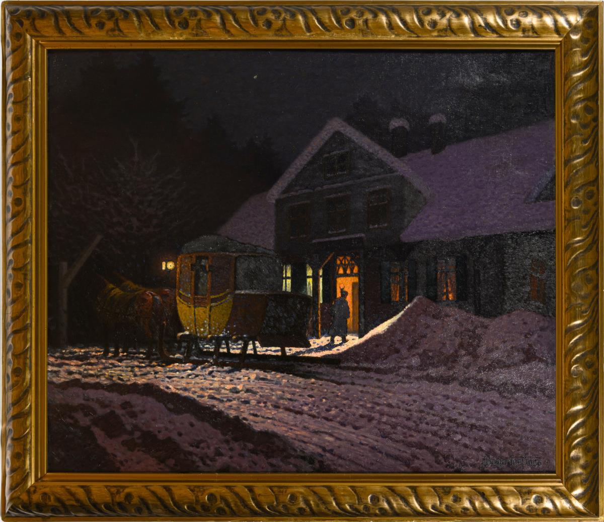 Die schmalkaldener Postkutsche vor dem bekannten Haus an einem dunklen Winterabend. Zwei kleine restaurierte Stellen mit Hinterklebungen.