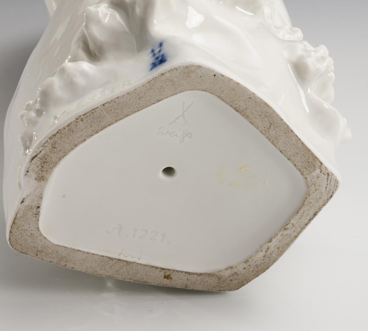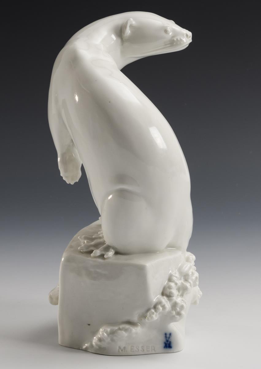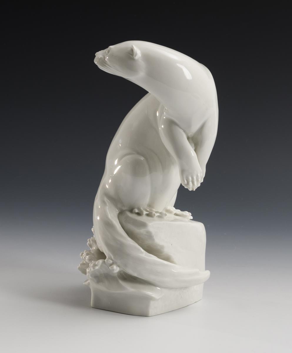 fast aufrechter Körperhaltung sitzenden Fischotters ist in einem Zustand hoher Anspannung dargestellt. Der Körper ist spiralförmig in sich gedreht, Kopf und Schwanz weisen in entgegengesetzte Richtungen. Große, glatte Flächen sind gekonnt mit stilisierten, äußerst feinfühlig ausgearbeiteten Details in Kontrast gesetzt. Durch den Verzicht auf eine farbige Bemalung liegt die Konzentration der Figur allein in der formalen Gestaltung. Auf der Weltausstellung 1937 in Paris wurde die Plastik „Fischotter“ mit einem Grand Prix ausgezeichnet. Es ist auch ein früherer Entwurf (Modellnummer A 1128, Höhe 42 cm) bekannt, wobei das Tier allerdings auf einem flachen Profilsockel gesetzt ist. Ebenso wurde das Modell des Fischotters in Bronze ausgeführt. (Petra Werner, in: Katalog: Auf der Pirsch - Jagdbare Tiere in Porzellan, Porzellanikon (Bd. 117), Hohenberg a.d. Eger 2015, S. 59/Kat.-Nr. 59).